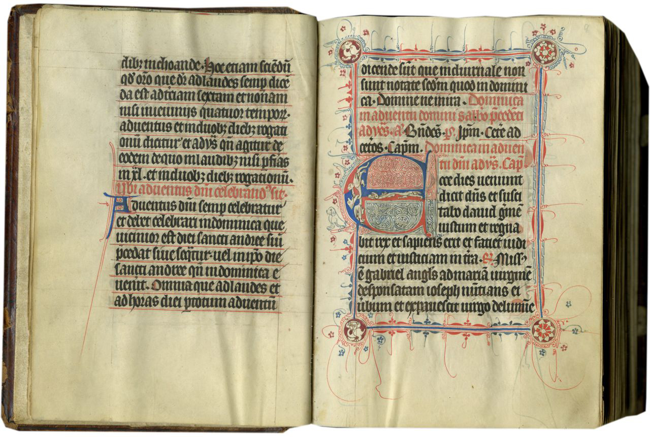 This regular and (at least in theory) regimented routine of daily prayer originated in monastic practice.  Monks and nuns were required by the Rules of their orders to pray the canonical hours every day, known as the Divine Office.  Many surviving monastic liturgical manuscripts were dedicated to this endeavor.  Books of Hours derive texts like the Hours of the Virgin from books like this Breviary (shown below), which brought together all of the prayers and other texts a monastic would need to pray the Divine Office.