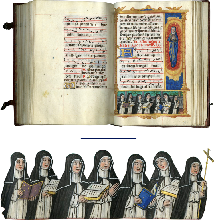 Dominican nuns carrying their Processionals at the Royal Abbey of Poissy. TM 1019, Processional, France (Paris), c. 1505-1515, ff.119v-120 and ff. 139v-140