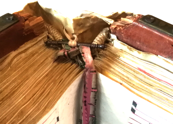 It also includes a very long note dated 1798, describing how it was updated and re-bound. This is fascinating evidence for how long it was in active use. It is bound in massive wooden boards covered with leather, armored, as was customary, with metal fittings. Its beautiful bookmark, made of metal and ribbons, still survives in the volume.