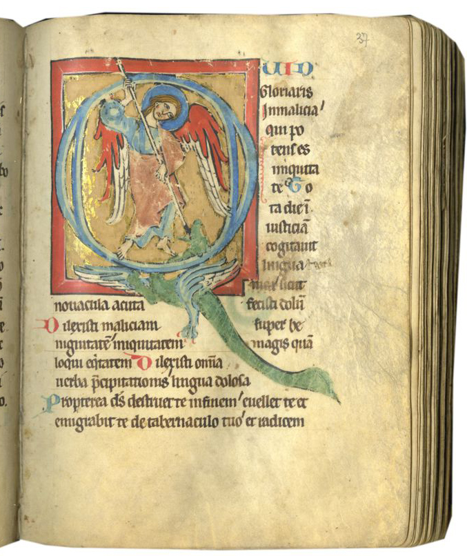 In closing, take a look at the beautiful image of St. Michael slaying the dragon found before Psalm 51 in the same manuscript. There is a little wear to this initial, especially on St. Michael’s robe, but his face and hands are intact. The amount of wear to this image, compared with the more extensive damage to the images of the two mendicant saints, seems quite striking.