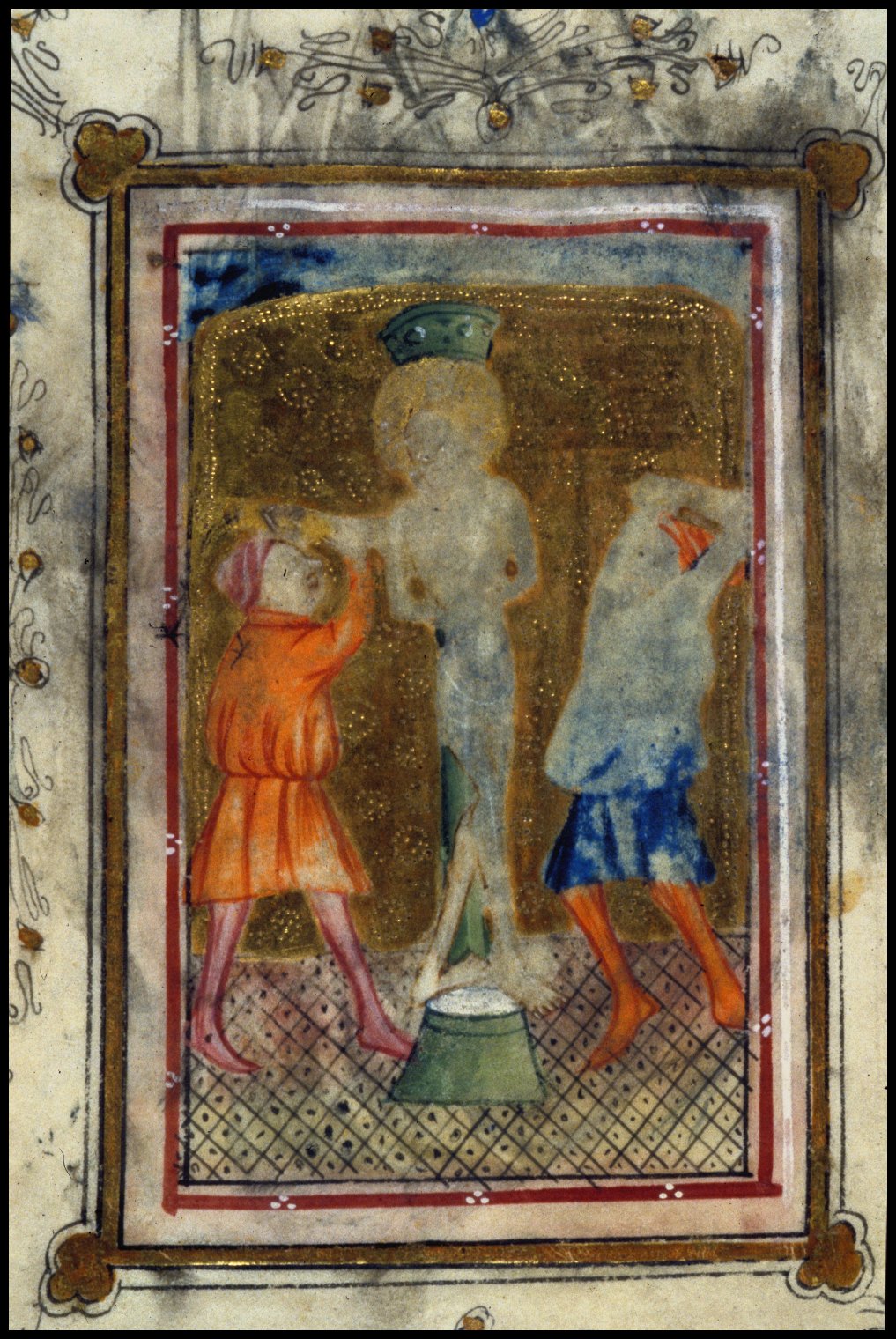 Similar damage in fact can be seen in this manuscript at the British Library, where the body of Christ has been almost totally worn away through years of devotion. The body of his torturer on the right, in contrast, may have been obliterated in iconoclastic anger.