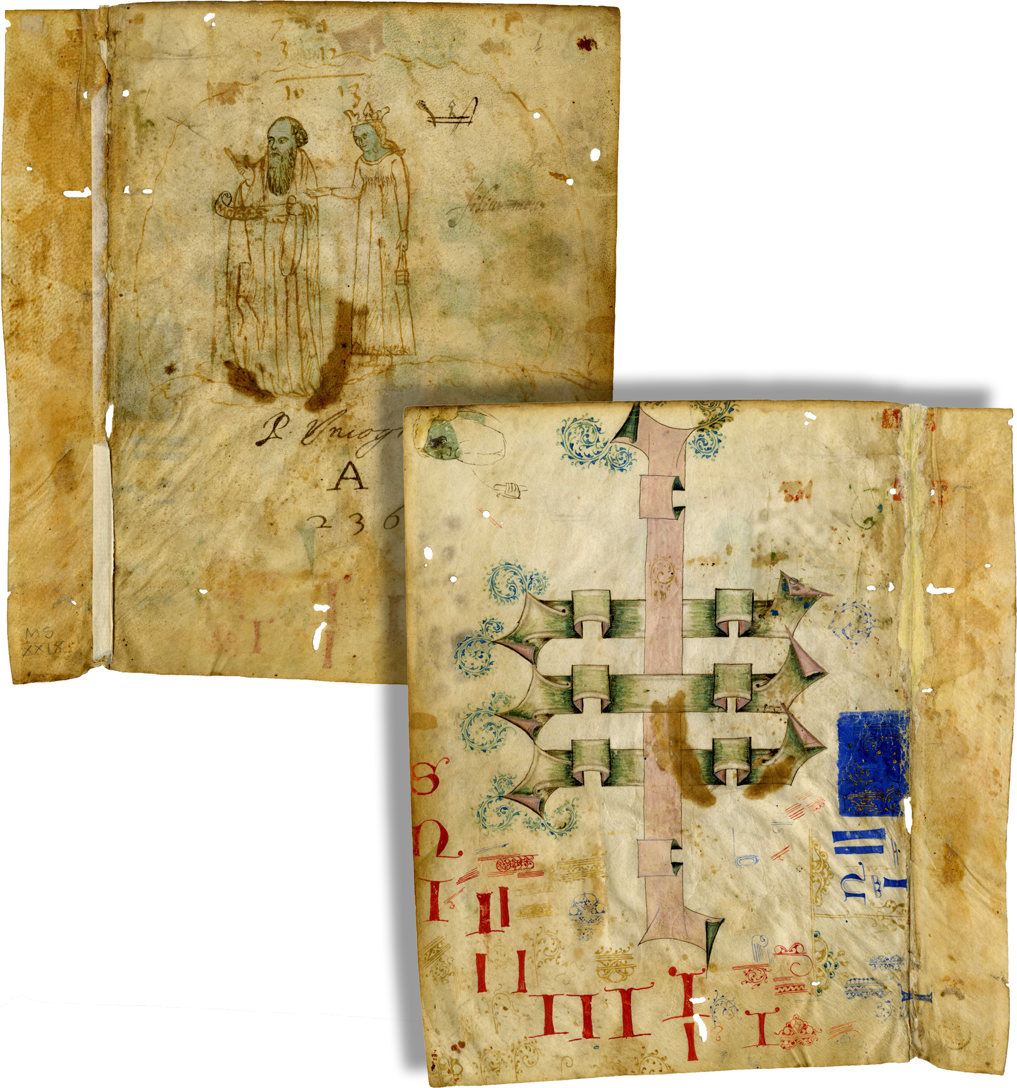 The holes left by book worms and the long crease make it clear that the parchment sheet was later used as a flyleaf in a book or manuscript. Although doodles and pen trials are often added to blank space in medieval books, the sheer number and position of the trials on our leaf suggests it was first and foremost a loose sheet of parchment, probably from a workshop in Northern Italy around 1400. (For a fantastic roundup of medieval doodles and pen trials go to Erik Kwakkel’s blog post “Doodles in Medieval Manuscripts”.)
