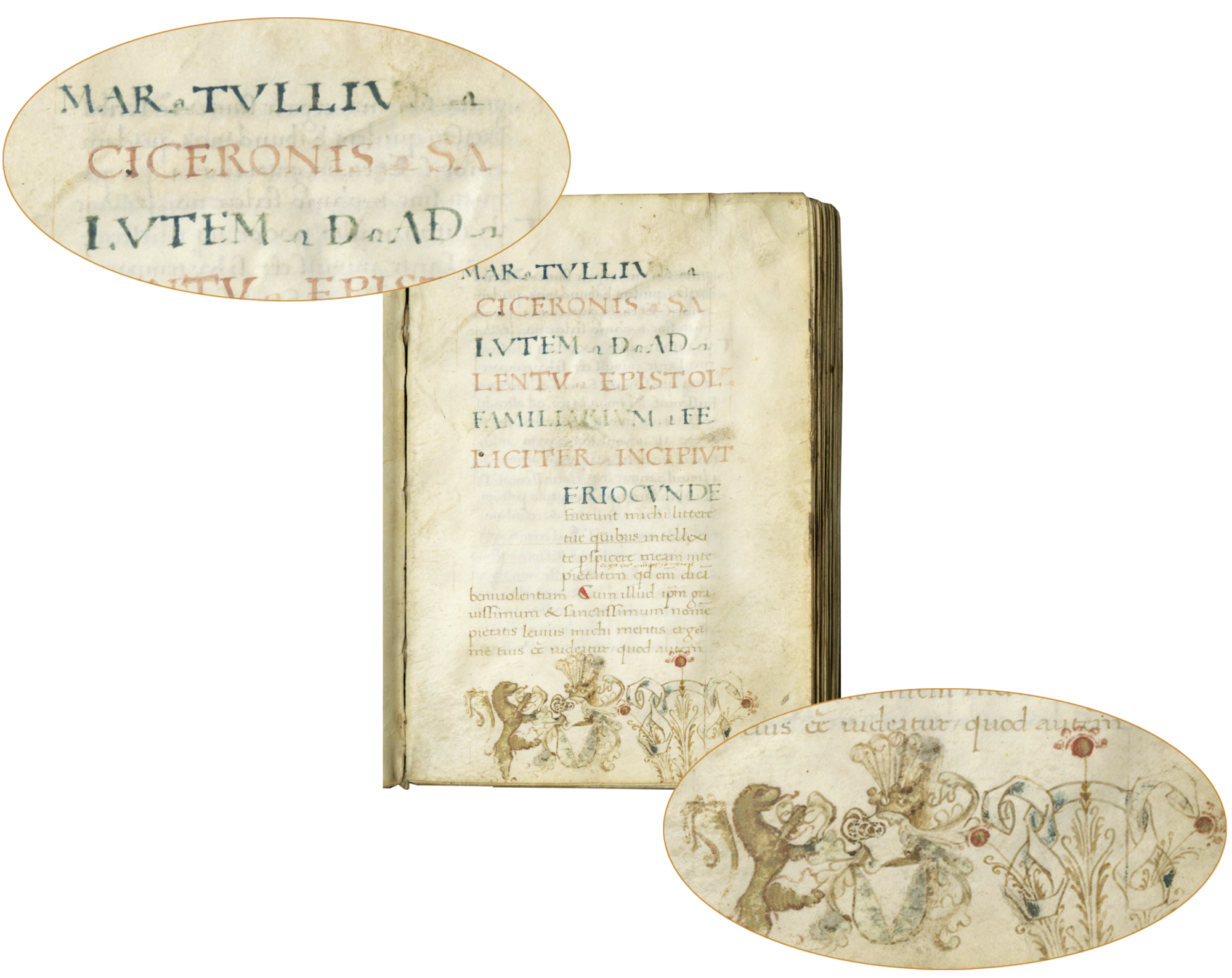 Opening folio of TM 914, Cicero, Letter to Friends, with the coat of arms of its original owners.
