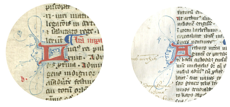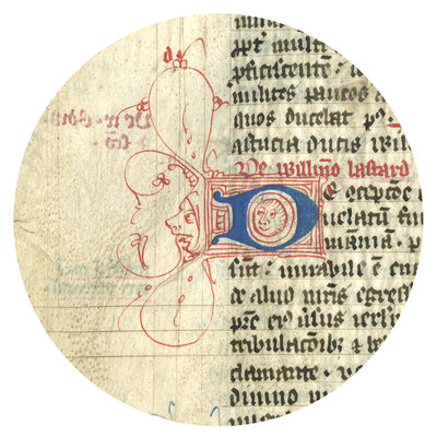overhead, this face adorns an initial in a chronicle of English history, the Eulogium historiarum, TM 836, f. 20v (detail), England (Malmesbury?), c. 1375-1400