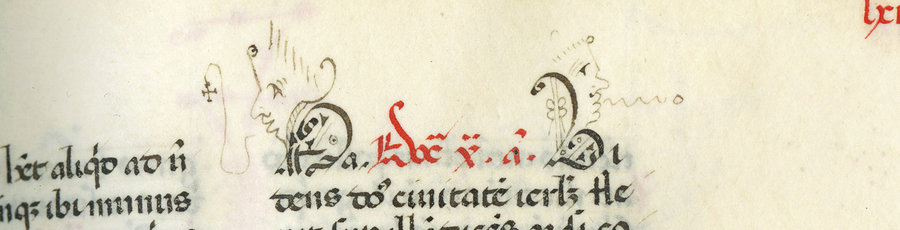Entranced by the pen decoration curling overhead, this face adorns an initial in a chronicle of English history, the Eulogium historiarum, TM 836, f. 20v (detail), England (Malmesbury?), c. 1375-1400