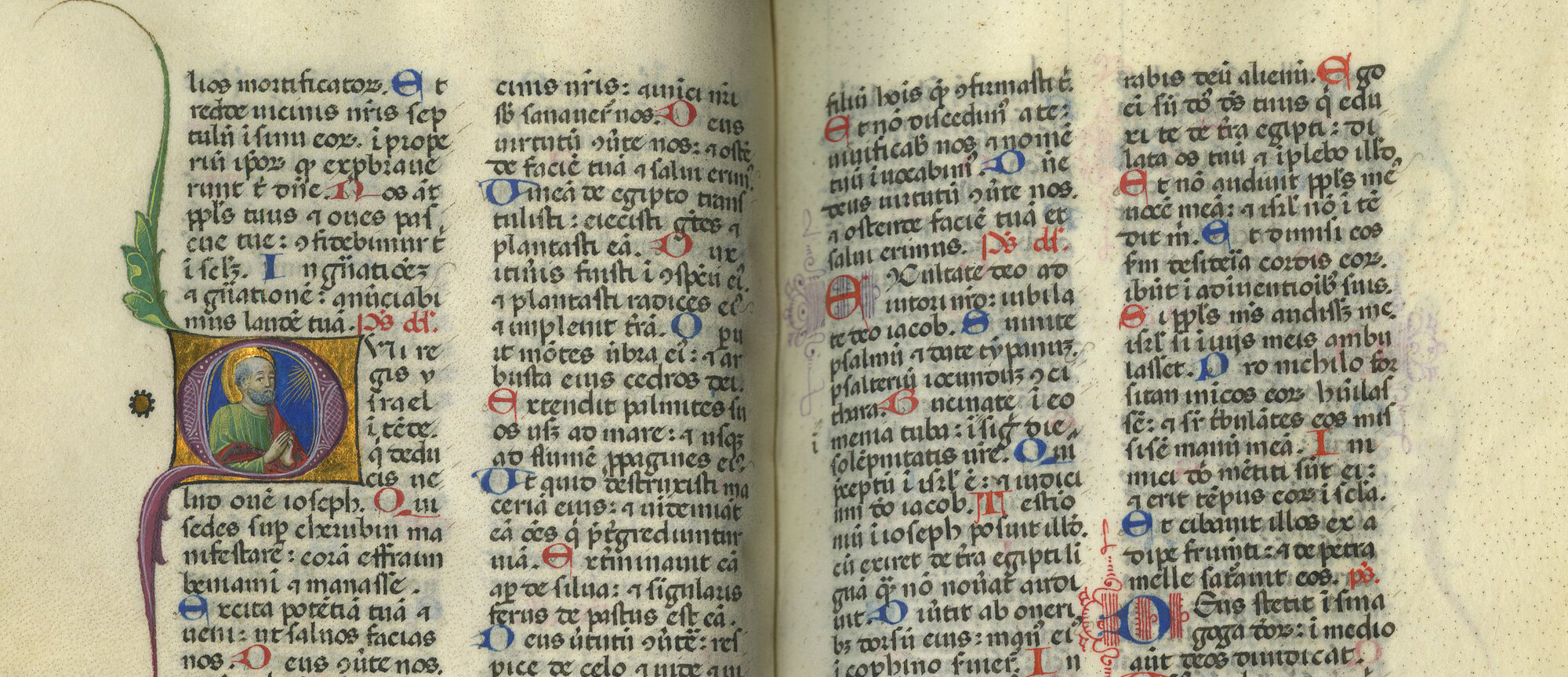 Painted initials on glimmering golden grounds frame saints at their devotions.