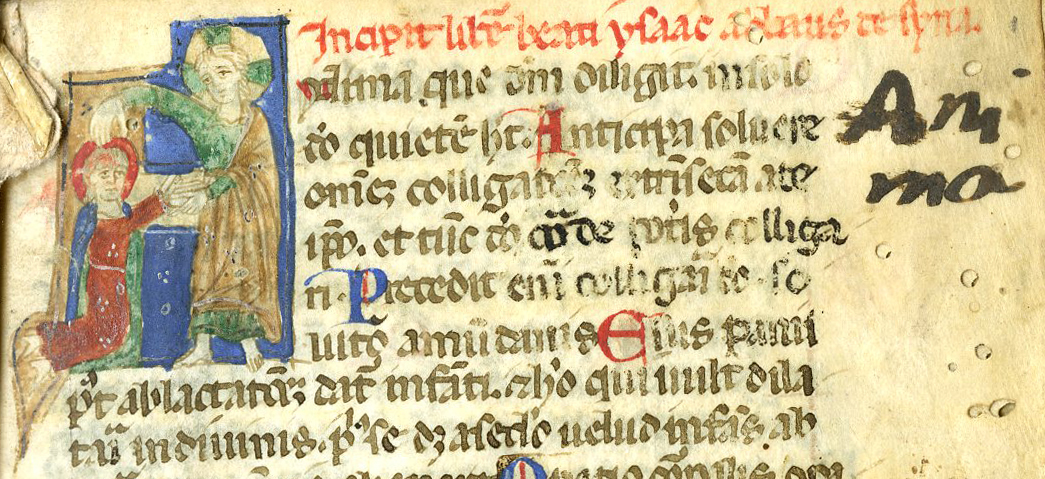This historiated initial depicts author Isaac of Nineveh presenting his Liber de contemptu mundi to Christ. The initial opens the same text in a Franciscan miscellany, TM 675, f. 1 (detail), Northern Italy, c. 1260-1280 and c. 1280-1300