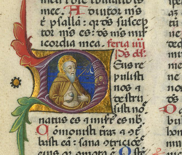 An unidentified saint clasps his hands in prayer in this historiated initial within an illuminated Carthusian Breviary, TM 815, f. 40v (detail), Northern Italy (Lombardy?), c. 1430-1450
