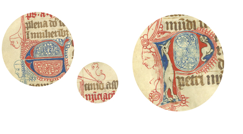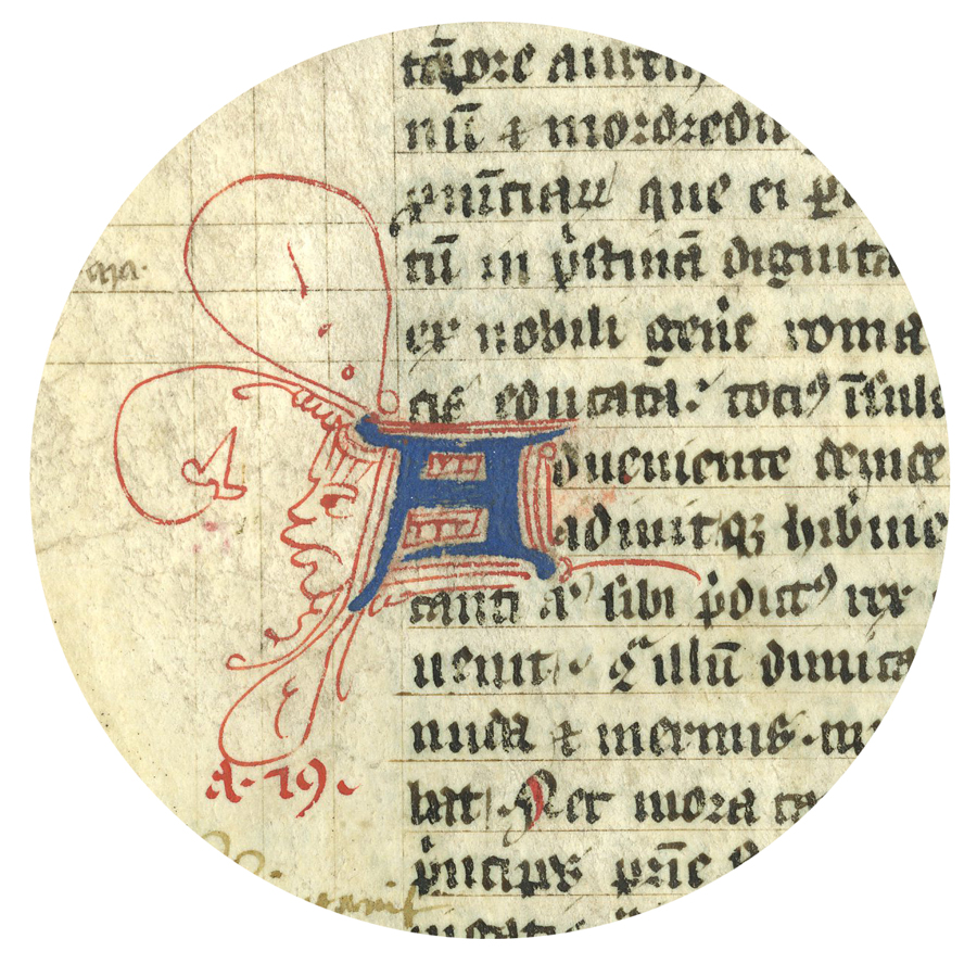 overhead, this face adorns an initial in a chronicle of English history, the Eulogium historiarum, TM 836, f. 20v (detail), England (Malmesbury?), c. 1375-1400