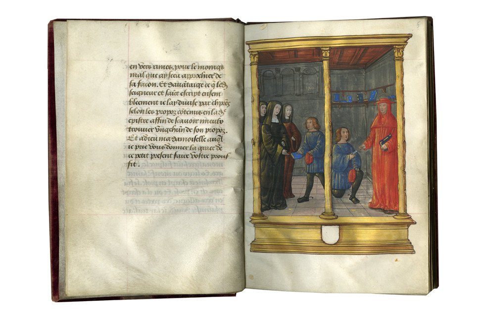 Saint Jerome (far right) gives an epistle to a messenger, who is also depicted handing it to Furia (far left), its intended recipient, in this elegant frontispiece, painted by the Master of Spencer 6, in this deluxe copy of Jerome’s Letter LIV to Furia, in the French translation of Charles Bonin, f. 5, France, likely Bourges, c. 1500-1510