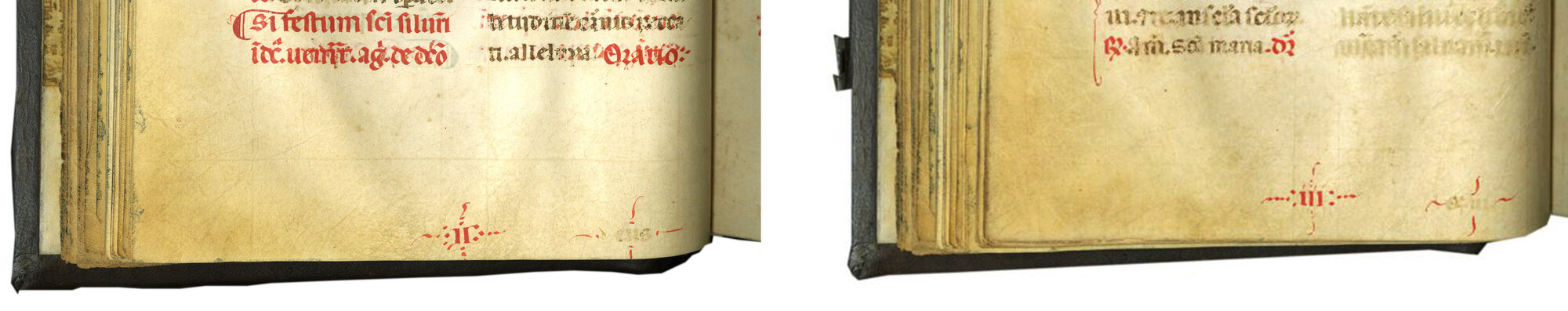 As a last note, this manuscript actually has a third system of numbering the quires – several texts are added before the Breviary text itself, including a calendar, organized over three quires. Someone – I would guess the fifteenth-century binder of the volume – added letters at the beginning of the quires in a series that include these preliminary texts.