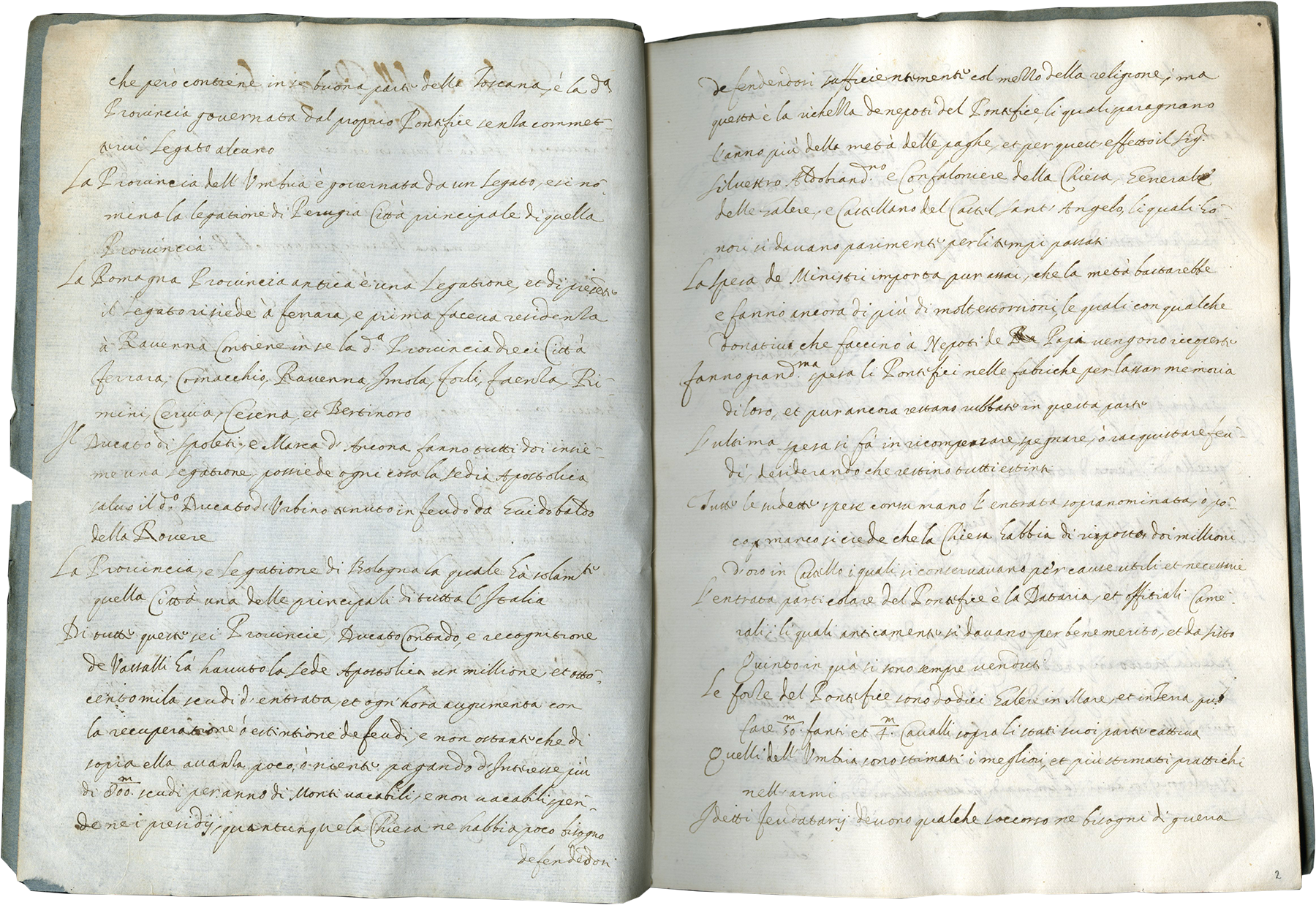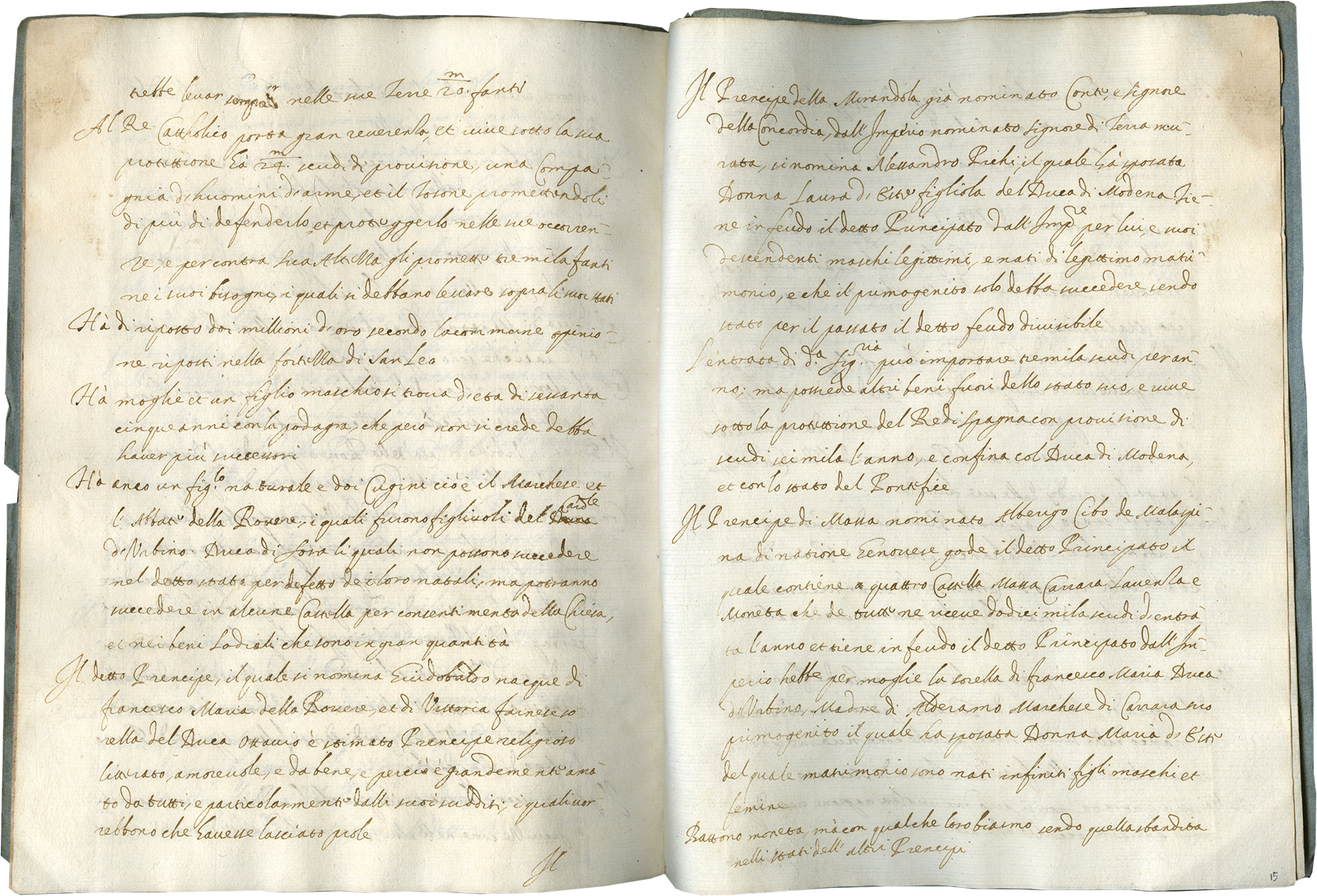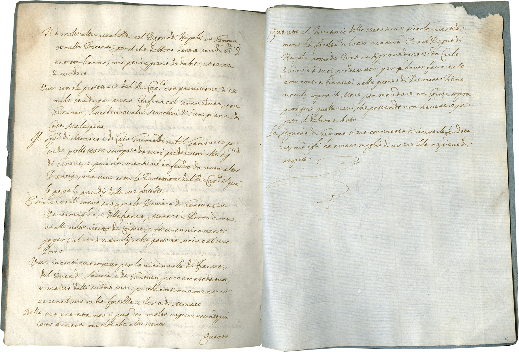 16 folios on paper, modern foliation in pencil bottom right recto corner, complete, two watermarks, first, 1-10, a bird in a circle standing on mound, similar to Briquet no. 12247, Pisa, 1598-1604, 11-16, second, 11-16, bird in a circle with a six point star atop, similar to Briquet no. 12251, Salerno 1590, (collation i16), catchwords on each verso, blind ruling on vertical margins, no line ruling (ruled space 153 mm)., written in Italian cursive script in brown ink in 24 long lines, at the beginning of each paragraph capitals are written outside the vertical bounding line, tear at the bottom of f. 12, top right of f. 13, top of f. 14, and top right of f. 16, otherwise good condition. Modern binding, blue paper cover with typed title pasted on the front cover, Relatione [sic] delli Principi de Italia, Dimensions 260 x 196 mm.