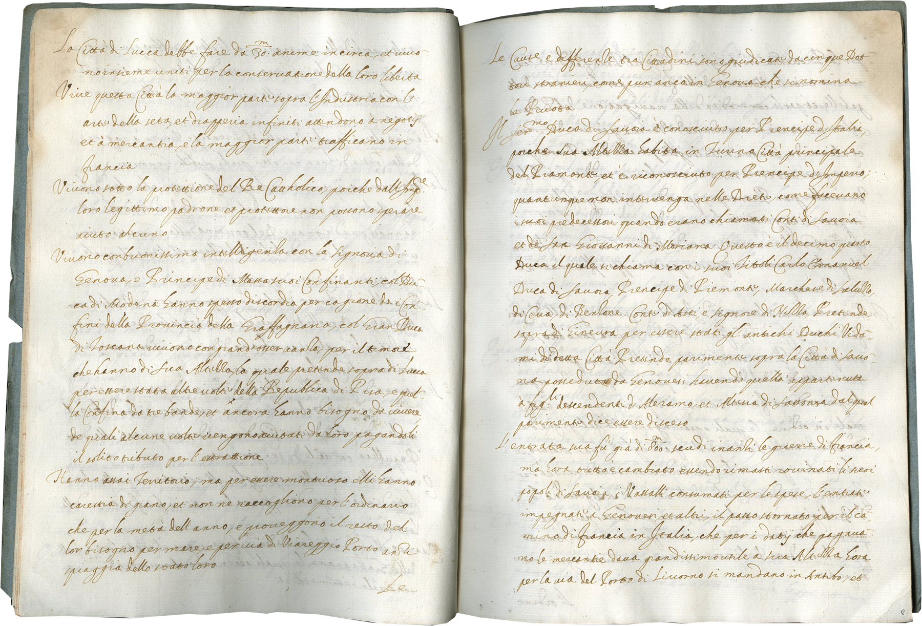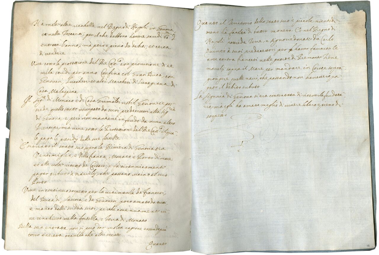 f. 1-16, Relationi delli Principi de Italia, incipit, “La Provincia di Italia è divisa in undici Principati, li altri Signori quacunque habtino il puro, e mero, et misto Imperio con autorità di fabricar moneta di oro, et di argento… La signoria de Genova si era contentata di riceverlo feudatario, mà egli ha amato meglio di vivere libero e pieno di sospetto.”