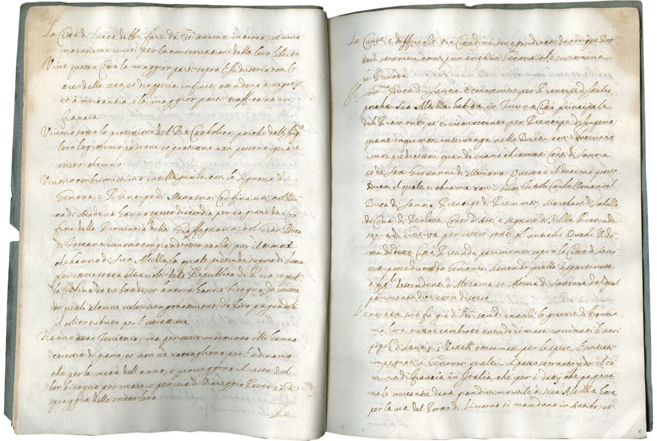 1. We know that the manuscript was produced in 1605 based on internal evidence on f. 9, where the eldest son of Carlo Emanuele I, the principe of Savoy, is said to be eighteen years old. The son can be identified as Vittorio Amedeo, who was born in 1587. The fact that the text spends little time discussing Tuscany might be an argument for the localization of the manuscript there, since an ambassador would not concentrate on his own region.