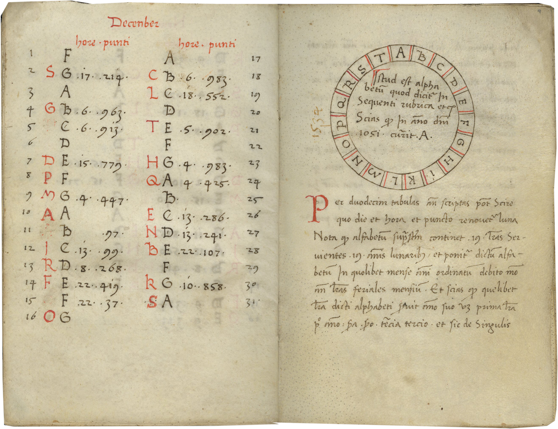 ff. 9rv, [Circular diagram with letters, A-T]; text inside the circle, “Istud est alphabetum quod dicitur in sequenti rubrica etc. Scias quod in anno domini 1051 currit A. [outside the circle, next to ‘P’], “1534”]. [Below the diagram, prose paragraph] incipit, “Per duodecim tabulas anni scriptas potest Scire quo die et hora et puncto renovetur luna. Nota quod alfabetum suprascriptum continet 19 literas seruientes 19 annis lunaribus … [f. 9v] Vnde primum A. dicti alphabeti seruit anno currentis 1520 … Similiter nota quod quelibet luna habet dies 29 horas 12 et punctos 793 etc.”;