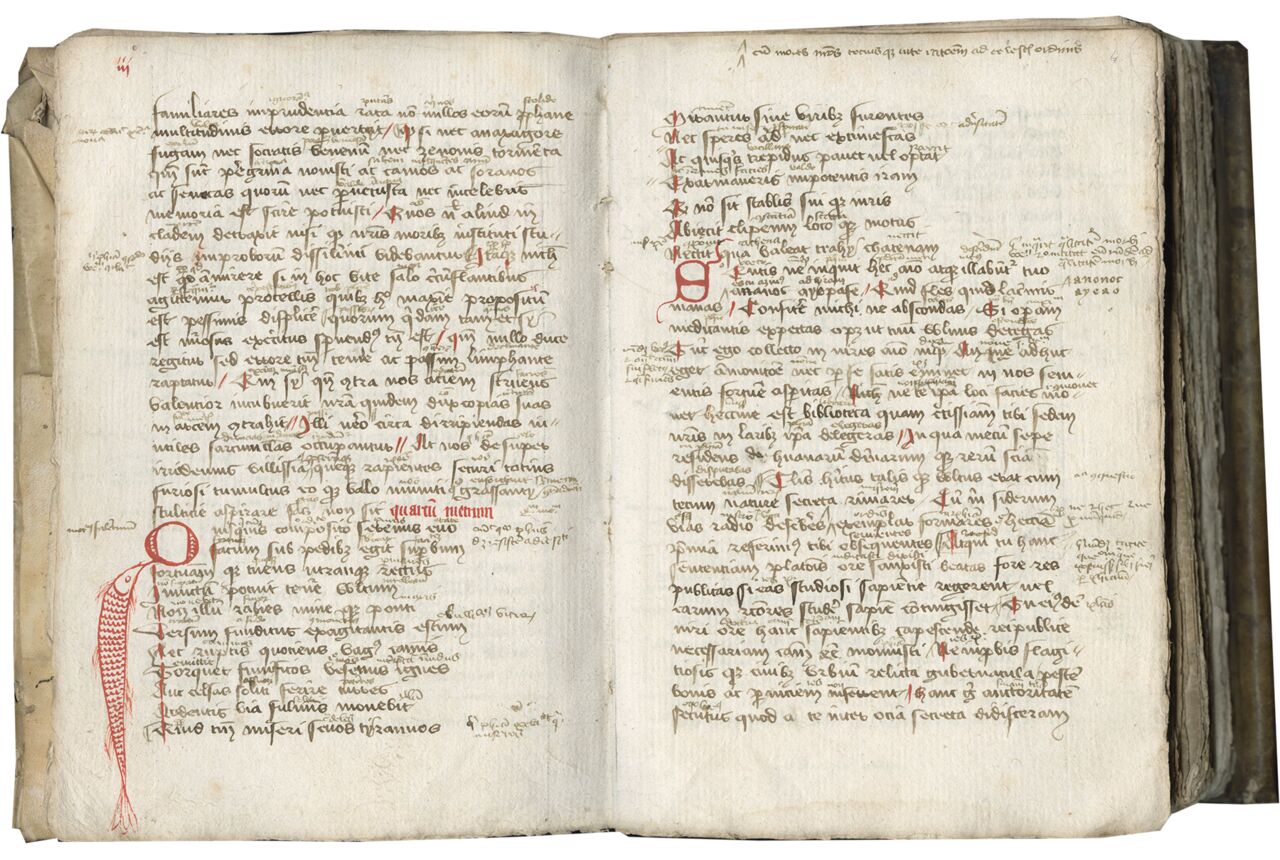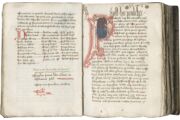 145 folios on paper, three watermarks: bell (similar to Briquet 4082), dolphin (unidentified), and cat (Briquet 3557), modern foliation in pencil, 1-145, complete (collation i12 [-1, lacking one leaf before f. 1, without loss of text; the leaf was blank, but had some contemporary notes] ii-v12 vi14 vii-xii12), horizontal catchwords, leaf signatures in Roman numerals, i-vi, written in red ink in the upper corner on the verso of the leaf (in the first half of the quire), frame ruled in lead point (justification 165 x 105 mm.), ff. 1-63 written in brown ink in gothic cursive script generally in one column (occasionally in 2 to 3 columns) on c. 21-30 lines, ff. 74-145 written in brown ink in gothic cursive script in two columns on c. 40 lines, capitals touched in red, some underlining in red, 2- to 4-line initials in red, some of which are decorated with small flowers, fish or geometric motifs left in reserve within the body of the initial, four large initials in red and brown inks and blue paint decorated with dragons, soldiers and flowers, some minor water stains, the first quire is detached and several quires are partially detached, in overall very good condition. CONTEMPORARY BINDING of limp vellum reusing an act of the Antipope John XXIII dated 1415 in Constance, the covers are lined with contemporary paper for reinforcement reusing pages from school manuscripts containing “versus memoriales” concerning grammar, history and medicine, attached to the spine are pieces of brown leather serving as bands onto which the sewing of the quires is attached, the sewing of the quires is reinforced with a strip of parchment placed in the middle of the quire reusing leaves from a contemporary music manuscript, covers stained and contain some worm holes, on the spine some of the visible sewing cords are broken, modern buckram case with decorated paper covers, in overall good condition. Dimensions 218 x 150 mm.