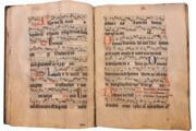 A Gradual is the liturgical book which contains the musical texts for the Mass arranged according to the liturgical year. During the Mass in the later Middle Ages, the priest used a Missal, whereas the cantors and the choir used the Gradual. The texts here include the complete liturgical year: the Temporal (Sundays and feasts celebrating the life of Christ, dependent on the movable feast of Easter), the Sanctoral (fixed feasts of the saints and Virgin Mary), and the Common of Saints. It is an example of a Choir Book, that is a liturgical manuscript designed to be large enough so that the entire choir could sing from a single manuscript, a practice amply documented by miniatures of such groups in manuscripts of the period. These manuscripts often remained in use for several centuries, as was the case here.