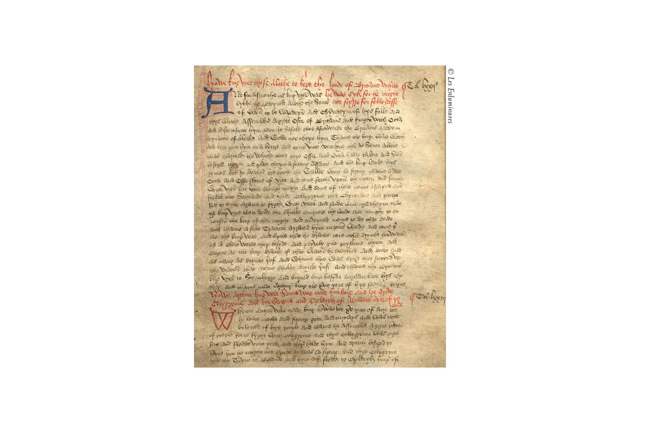 The earliest prose chronicle in English, this history is known as "The Brut" or "The Brut Chronicle," because it starts with the legend of the hero Brutus, his conquest of Albion and the naming of the land Britain after him. It was composed in Anglo-Norman sometime after 1272, then extended to 1333, and, finally, in about 1400 translated into English. It was intended for reading aloud to a knightly audience.. Showing a concern throughout for the noble and the heroic and in the early sections mixing fact and fiction, The Brut includes much material in the later sections reflecting the political and practical concerns of wealthy merchants and civic leaders.