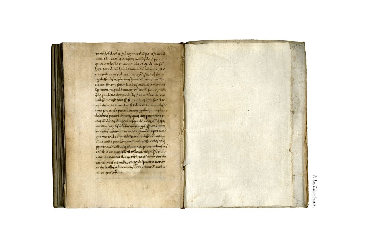 90 ff., preceded and followed by a paper flyleaf, complete (collation: i12, ii8, iii-ix10), on paper with watermarks close to Briquet, “Huchet”, no. 7834, Rome, 1470 and Piccard, “Wasserzeichen, Horn” (1979), VIII, no. 36, Rome, Urbino, 1460, written in a humanistic semi-cursive script, in brown ink, on up to 25 lines, paper ruled in lead point (justification 150 x 85 mm.), spaces left blank for decorated initials, never executed, some marginal annotations in a cursive script. Bound in limp vellum over pasteboard, perhaps redone in imitation of a contemporary vellum binding, smooth spine, with title in pencil faintly visible (Generally in good condition, a few wormholes, a bit of staining to paper). Dimensions 200 x 147 mm.