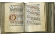 iii (paper) + i (parchment) + 208 + iii (paper) folios on parchment, modern foliation in pencil top outer corner recto, missing three leaves (collation i-xvi10 xvii12 xviii10 [-8, 9, 10, three leaves following f. 179] xix8 xx12 xxi9 [structure uncertain]), no catchwords or signatures, ruled in ink with the top and bottom horizontal rules full across, full-length vertical bounding lines (justification 70-68 x 45-42 mm.), written below the top ruled line in a gothic bookhand by several scribes, red rubrics and paragraph marks, one- and two-line alternately red and blue initials, 15 five- to six-line polished gold initials with green (with touches of red), red (often with touches of green), blue, or purple (with touches of green) penwork, one TEN-LINE GOLD INITIAL on f. 1, infilled with purple penwork, partially filled with green, with a BLUE AND GOLD ANGLE-BORDER in the inner and lower margins extending from the initial, in good condition, top outer corner of f. 192 torn (extending into the text, which remains legible), some thumbing. Bound in seventeenth-century(?) vellum over pasteboard, sewn on three bands, edges dyed bluish-green, detached and fully separated from the book block at the back joint, but otherwise in good condition. Dimensions 97 x 70 mm.