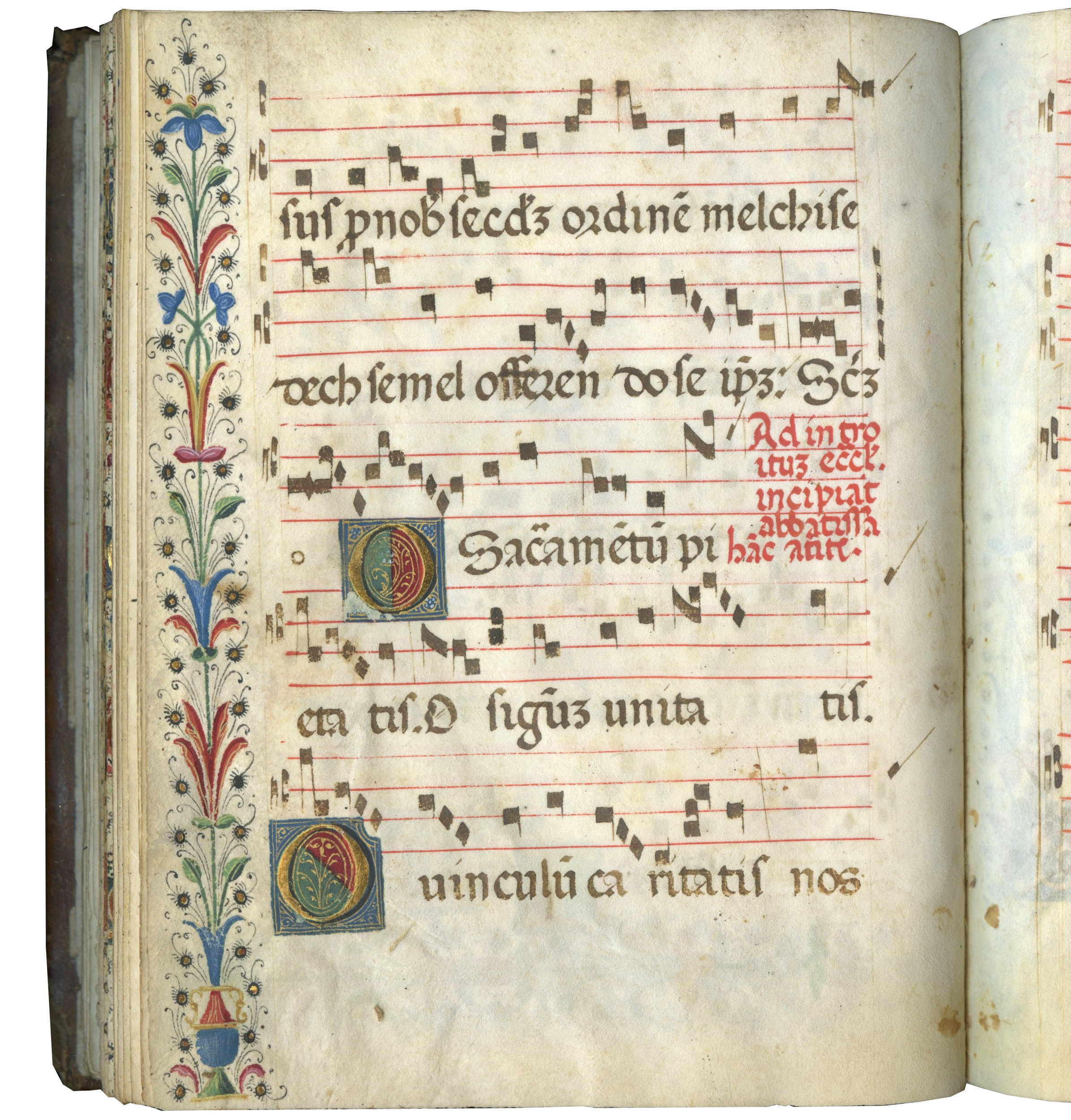 i (paper) + 38 + i (paper) on parchment, modern foliation in pencil top outer corner recto, complete (i12 ii8 iii10 iv8 [-8, cancelled with no loss of text and then replaced by a later leaf]), no catchwords or signatures, ruled in ink or lead with double vertical bounding lines, text copied between narrow double horizontal rules with ascenders and descenders extending above and below (added?) (justification 143 x 124-103 mm.), written by a number of scribes in traditional rounded southern gothic bookhands, ff. 1-12, and 31-37v, and in an upright somewhat artificial script influenced by humanistic scripts, ff. 12-29v (possibly copied in several stints by an unpracticed scribe with varying results, or by several contemporary hands, ff. 17v-18 and ff. 22v-23 may be by different scribes), square musical notation on red four-line staves (some neumes in red and blue), black mensural notation, and white mensural notation on a five-line staff (f. 38 only), red rubrics, alternately blue and gold one-line initials, numerous (c. 90) one-line (and some larger initials extending above the text into the staff) polished gold initials infilled and on grounds of green, red and blue decorated in gold, a few with touches of white, infilling often divided in two with two colors, floral borders in the inner and/or lower margins of forty-five pages with narrow red, blue and green flowers and leaves, set within a background of small gold balls with hairlines and stems in black ink, the volume has been well-used, some soiling throughout, lower margin of border abraded on ff. 1 and 2, initials and borders rubbed and damaged on f. 18v, trimmed, with occasional loss of part of the decorative borders or occasionally initials (ff. 1v, 3v, 7v 10v, 18v, 19v, 21v, 22v, 23v, and 25v). Bound in handsome seventeenth-century (?) brown leather over pasteboard, tooled in blind with two sets of five fillets forming an outer border gold-tooled with a winding floral pattern, and a rectangular center panel with gold-tooled fleurons at the corners, and center medallions lettered on the upper board, “D. M.//DIACI//NTA”, and on the lower, “PAVOL//SANTI”, spine with four raised bands, tooled in blind and with small gold stamps, upper board partially detached (supports broken at the joint), covering at the top and lower portion of the spine damaged, covers slightly bowed, and with some worming. Dimensions 187 x 142 mm.