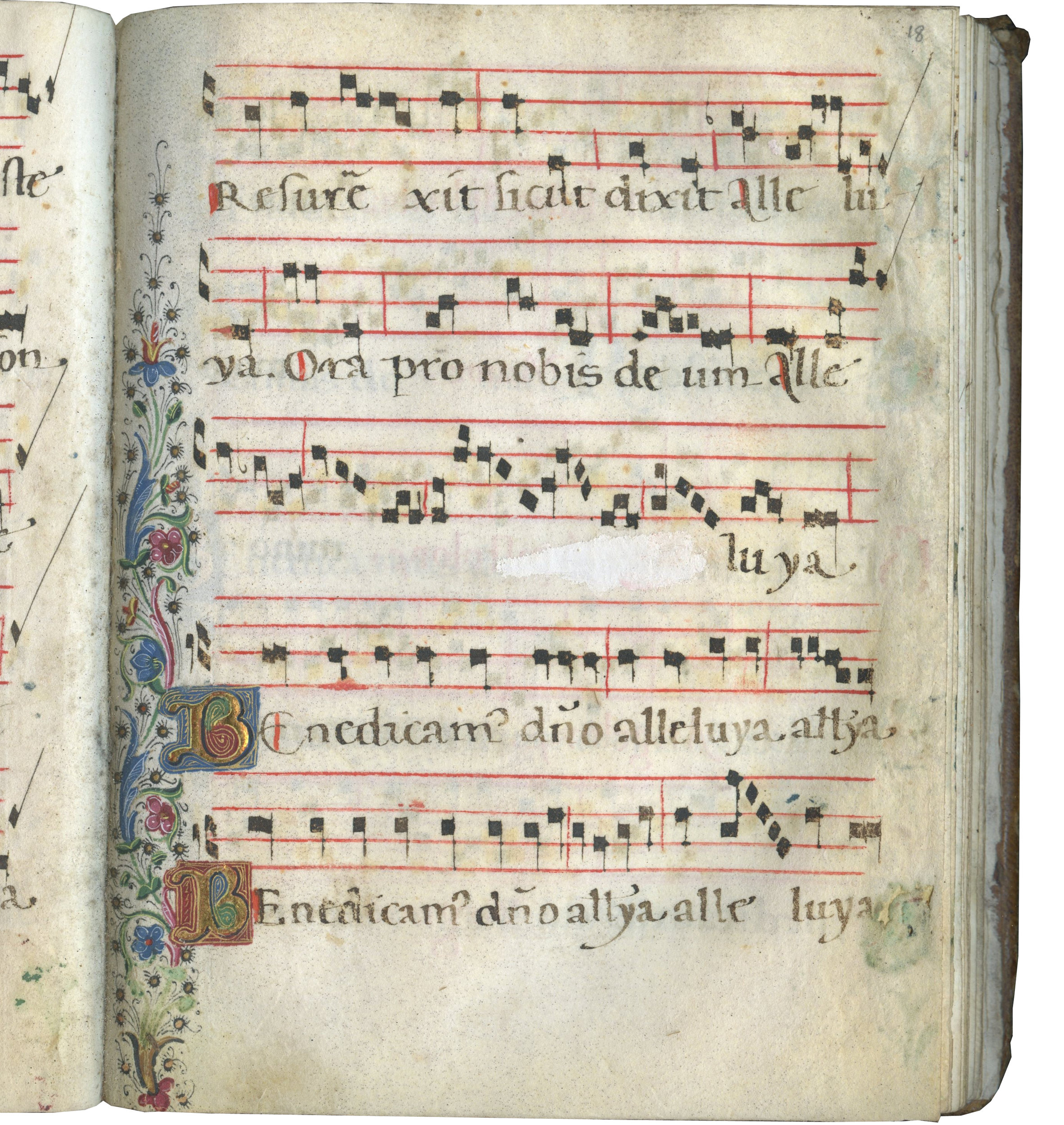 Musically two aspects of this manuscript are of interest. First, it includes a tonary (that is a collection of chants organized by modes, ordinarily used for teaching the chant). And secondly, there are a number of features of the musical notation that are of interest. Even this late example of black square notation includes liquescences (changes in the shape of the neumes, usually used where syllables must be connected in a fluid, soft manner). Other details of interest include the use of blue notes for certain passages, and red notes at the beginnings and ends of pages; exactly what is meant by the change in color is a matter for further research. Fermata were added in the Credo, which is in part written in black mensural notation (mensural notation indicates the length of individual notes, unlike the square notation used for most chant). The Marian litanies at the end, on f. 38, are in white mensural notation.