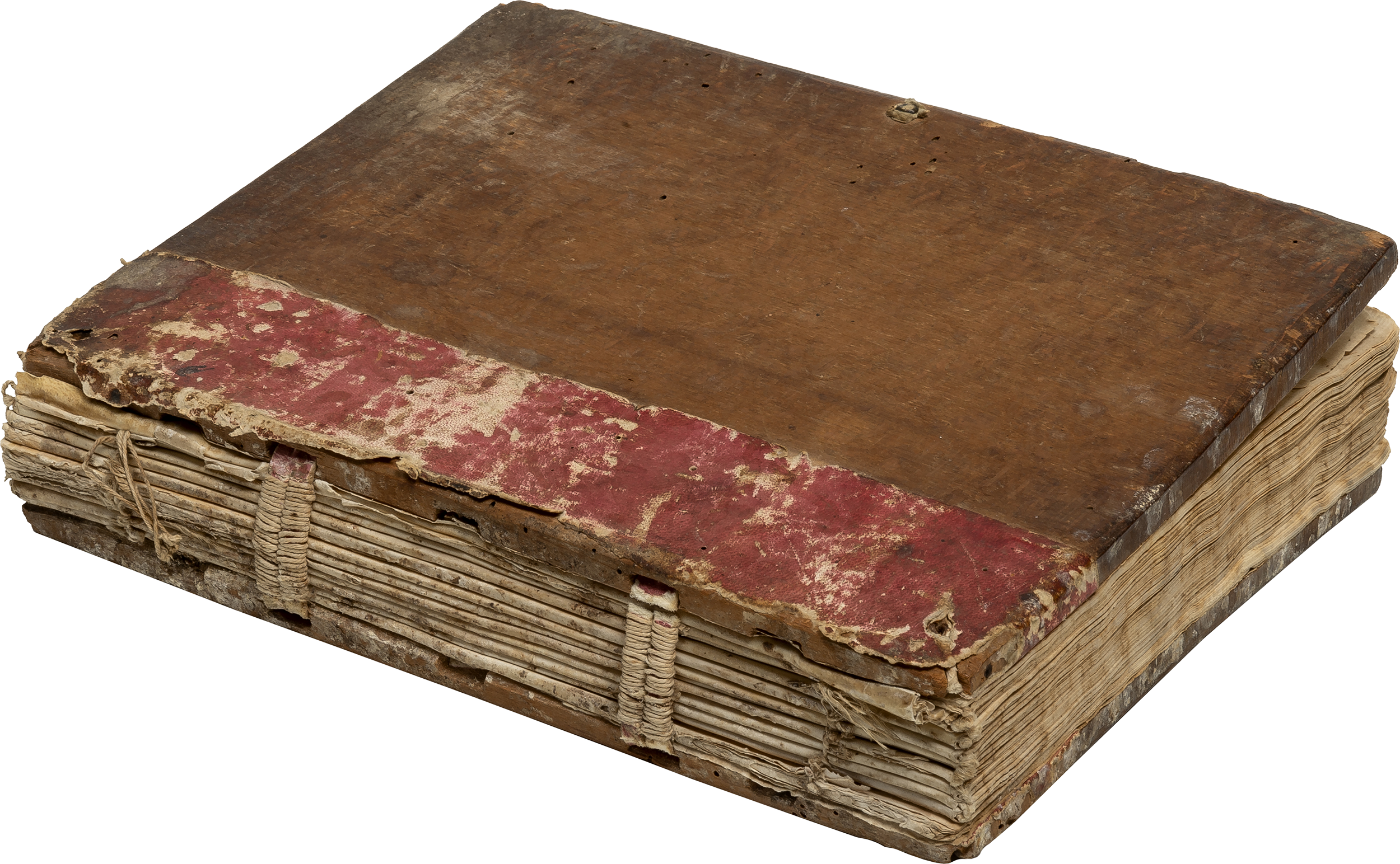 130 folios on paper, watermark, horn, horizontally orientated, string visible on horn, close to Piccard online no. 119303, Vicenza, 1429, modern foliation in pencil top outer corner recto, complete (collation i16 ii-iii12 iv10 vi-vi12 vii10 viii6[ending f. 87v, -4, 5, 6, three leaves cancelled with no loss of text] ix12 ii-xi10 xii12 [12, pastedown]), no signatures or catchwords, unruled, but with leaves folded or ruled in blind for full-length vertical bounding lines with an additional fold/rule down the middle (justification 215-210 x 110-105 mm.), copied by several scribes in 39-54 long lines, rubrics and headings in a larger rounded gothic bookhand, text in small current gothic scripts, quickly written but very legible, 2-line initials in text ink with pen flourishing in various styles, some quite exuberant, f. 61v, diagram, tree of consanguinity (undecorated circles), f. 1, partially detached, edges frayed, light stains lower margins through f. 4, some worming, some ink burns (f. 73v-74, 76, resulting in small holes in the paper) and bleed-through, quires reinforced at the beginning and middle with some cracking along the reinforcement. ORIGINAL BINDING of wooden boards, cut square without a bevel, flush with the bookblock, spine now bare, small strip of red leather front cover (so once quarter bound?), and a fragment on back, sewn on two bands, nail on front cover from strap (once fastened front to back, straps now missing), unrestored and fragile, front cover almost completely detached. Dimensions 280 x 210 mm.
