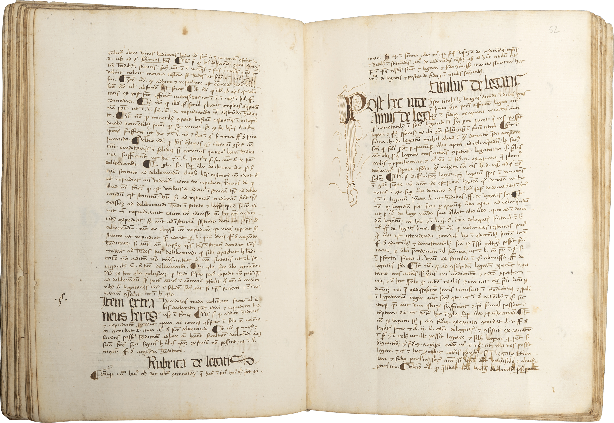 The Corpus Iuris Civilis (“Body of Civil Law”) is the name given to the collection of legal texts issued from 529 to 535 by order of Justinian I, Roman Emperor. The Corpus included originally included the Code (Codex), a compilation, by selection and extraction, of imperial enactments to date, the Digest or Pandects, an encyclopedia composed of mostly brief extracts from the writings of Roman jurists, and the Institutes (Institutiones), the subject of our manuscript. These texts were updated in the Novelle in 556. During the Middle Ages, the Justinian Corpus was the focus of intense study from the eleventh century; it was “received” or imitated as private law and its public-law content was quarried for arguments by both secular and ecclesiastical authorities. This revived Roman law, in turn, became the foundation of law in all civil law jurisdictions.