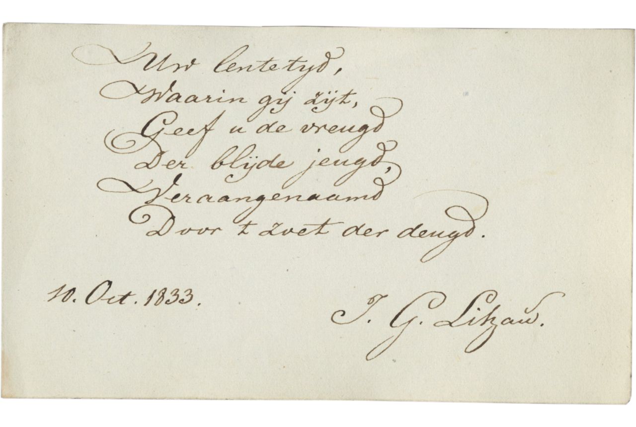 f. 18, Poem in Dutch, signed “10 Oct. 1833 J. G. Litzaw”; [f. 18v, blank];