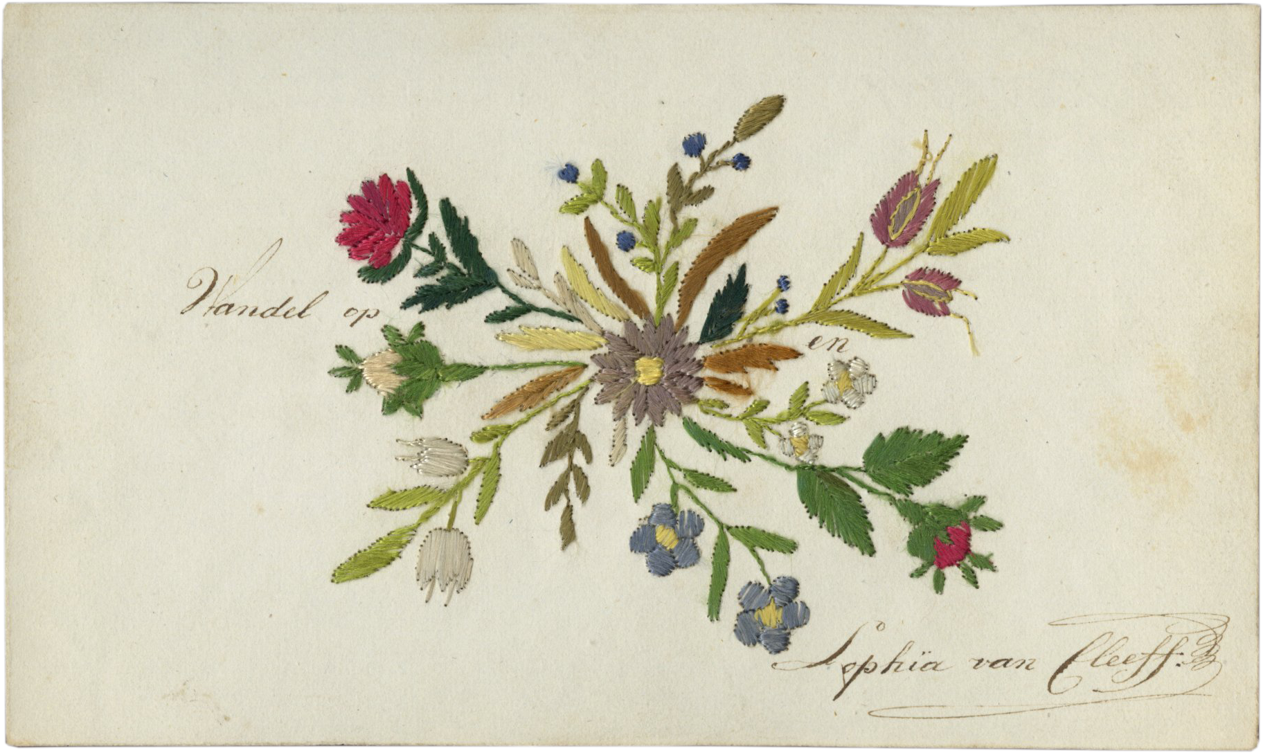 f. 6r-v, Entry by Sophia van Cleeff: “double-sided” embroidery representing a radiating spray of flowers, including roses, lilies of the valley and forget-me-nots, with the inscription “Wandel open” (Turning open) and signature on both sides;