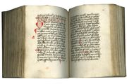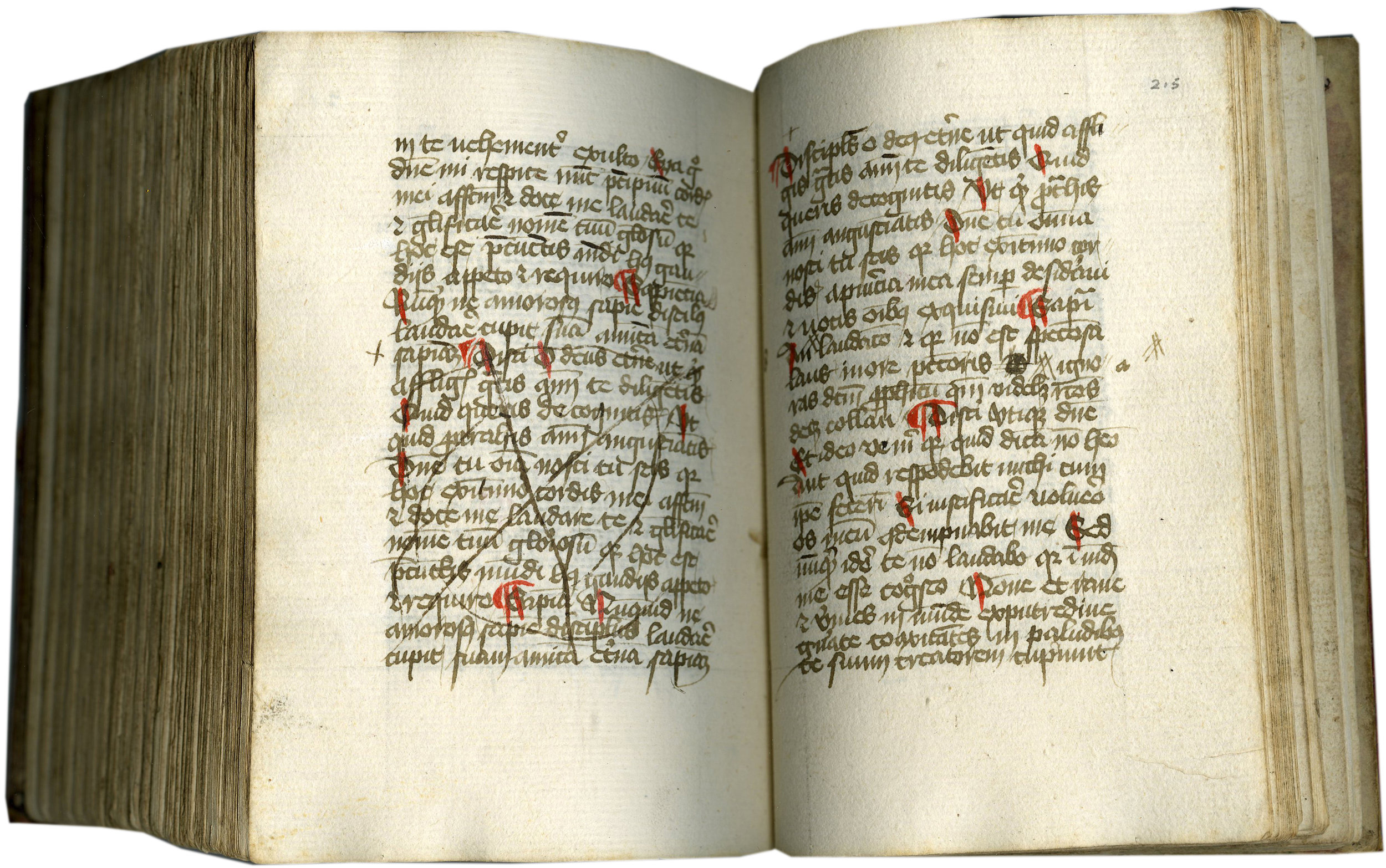 The manuscript was carefully corrected throughout, usually involving a single word; longer passages were also occasionally omitted by the scribe and supplied in in the margins by the corrector (for example, ff. 22, 29, and 40v); a long passage copied in error twice on ff. 214v-215 has been crudely crossed out on f. 214v. The scribe notes that he finished the manuscript on the Friday after Easter in 1426, underlining his text in red (the practice used for rubrics throughout the manuscript). Following this is a second note, this time in red, which states that the work was completed on the following day on the feast of St. Ambrose, perhaps indicating that the corrector was finished with his part of the task. (The Friday after Easter in 1426 was April 5, and the feast of St. Ambrose was commonly observed in the Middle Ages on April 4, so it is possible that the scribe recorded the date he finished the manuscript incorrectly).