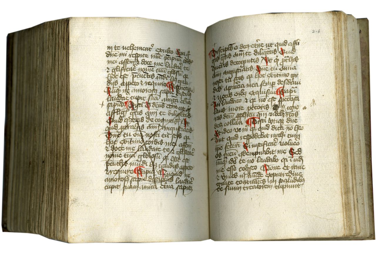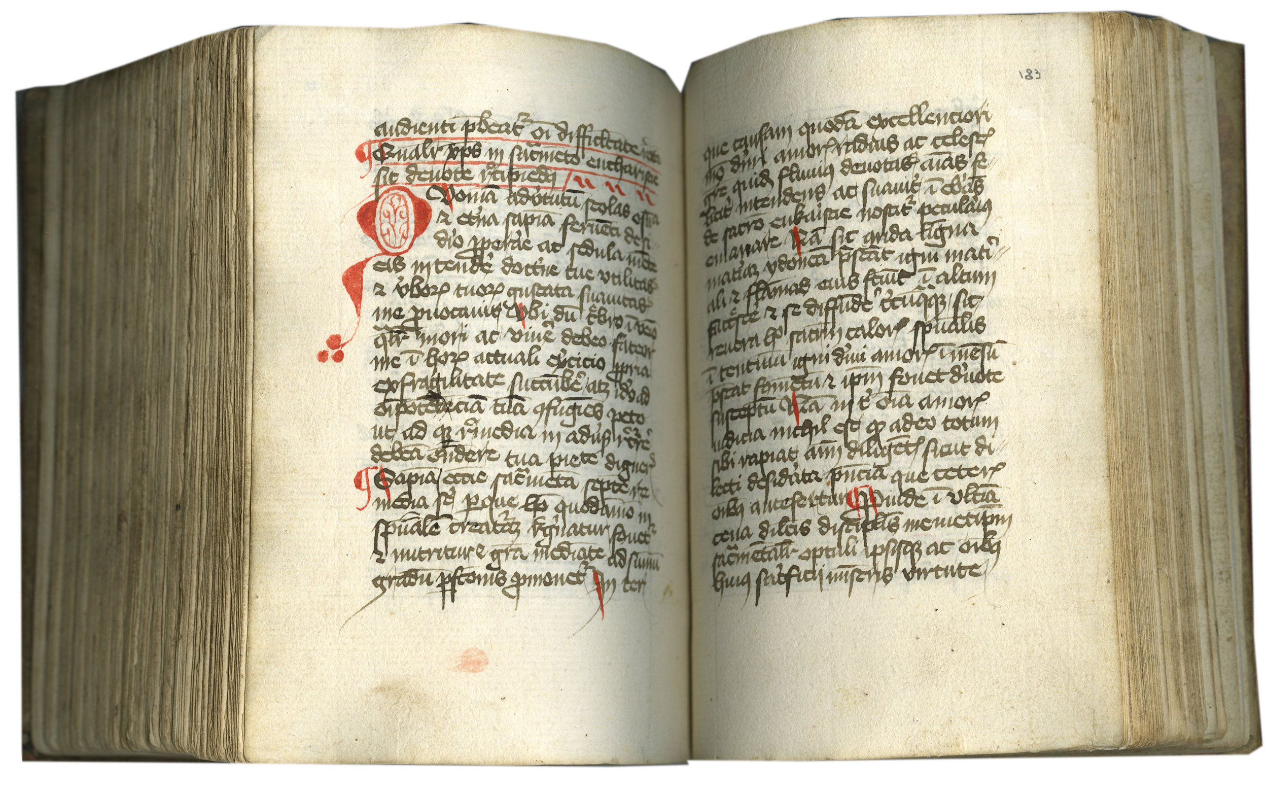 The Horologium sapientiae is dedicated to Hugo de Vaucemain, allowing us to date the prologue between 1331 and 1341, probably c. 1334, while Hugo served as master general of the Dominicans; the work was probably completed a few years earlier, c. 1330. Throughout the fourteenth and fifteenth centuries it was a tremendously popular text, surviving in hundreds of manuscripts in Latin and in translations in French, Dutch, and English, as well as in other languages. The largest numbers of copies with a known provenance are from Benedictine abbeys – it was especially popular at reformed abbeys of the Bursfeld Congregation; similarly we find copies at Augustinian houses, including houses associated with the Windesheim Congregation, as well as among the Carthusians, and Dominicans (Künzle, pp. 215-219). Numerous copies of course survive with no known provenance. It is interesting to compare this unassuming, carefully corrected, Latin copy of the text with elegant French copies or the richly illuminated Brussels L’Horloge de Sapience, suggesting this was a copy from a monastery or a house of Canons, or even one owned by a cleric associated with the Devotio moderna.