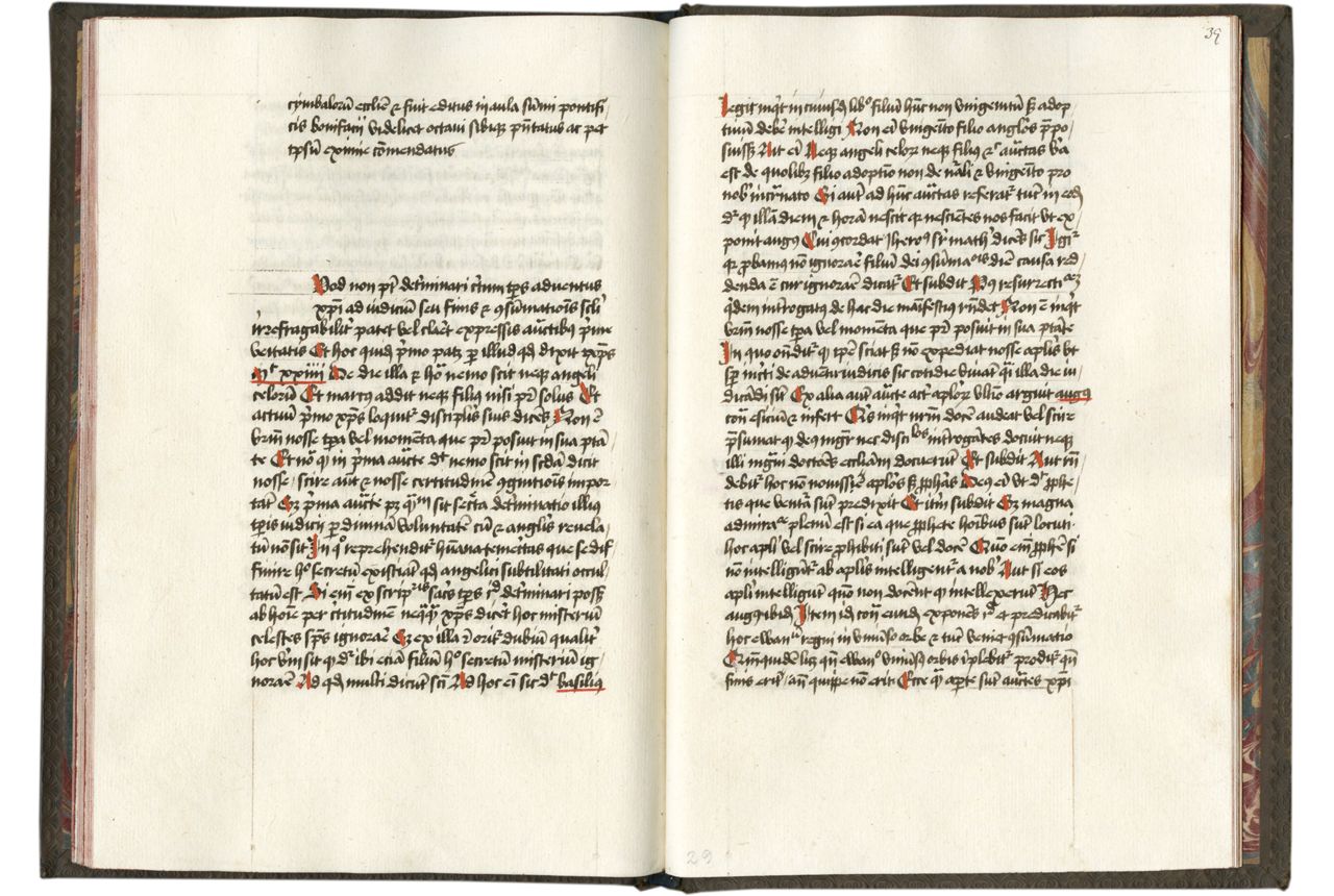 ii + 33 + ii folios on paper, watermarks similar to Briquet no. 8669, “Lettre P”: Avallon, 1486, Solothurn, 1488, Namur, 1491; Briquet no. 11417, “Main”: Troyes, 1477-80, Bouvignes, 1477, Rijnsburg, 1479-86, Amsterdam, 1480, Saint-Omer, 1480, Nancy, 1480, Mézières, 1481, Paris, 1481, Troyes, 1481, Utrecht, 1481-82, Namur, 1482-88, Decize, 1483, Cologne, 1483, Siegen, 1484, Cleves, 1484, Rouen, 1485, Frankfurt am Main, 1485, Colmar, 1490, traces, now mostly cropped away, of contemporary foliation in Arabic numerals on ff. 1-9, upper outer rectos, 97-105, later pagination in ink on ff. 10-31, upper outer rectos, 1-43, modern foliation in pencil, lower inner rectos, 1-33, complete (collation i8 [+9; f. 9 added at the end of the quire] ii-iii12), traces of quire signatures on ff. 1 and 22, now mostly cropped away, ruled in lead with full-length vertical bounding lines and horizontal upper bounding lines, prickings lower margin, written in two hands: (1) ff. 1-9v, in a Gothic hybrida script in brown ink on twenty-eight long lines (justification 146 x 83 mm.) and (2) ff. 10-31, in a cursive Gothic script in dark brown ink on twenty-seven long lines (justification 139 x 79-80 mm.) with spaces left blank in the text, presumably where something was missing or obscured in an exemplar, red rubrics (ff. 1-9v), biblical references underlined in red, capitals highlighted in red, one-line red paraphs (ff. 10-31), one-line plain red initials, with guide letters visible (ff. 1-9v), blank spaces for one- to two-line initials, two with guide letters (ff. 30v. 26. 28v), two- to four-line red initials, ff. 1, 8, and 10, some marginal annotations by the two scribes and at least one additional contemporary hand, identifying inscription in modern hand at the top of f. 10, slight soiling of final blank leaves, but otherwise in excellent condition. Bound in twentieth-century brown leather, blind-stamped with rectangular frame formed from two sets of double fillets with flowers stamped in corners of frame and along the edge closest to the spine and arabesques stamped inside of it, all over beveled wooden boards, spine with five raised bands, red leather label on upper board with gilt inscription, “DISPUTATIO DE ANIMA EX SS. / AUGUSTINO ET HIERON. / ET ARNOLDI DE NOVA VILLA / DE / CONSUMATIONE ET / TEMPORE ANTICHRISTI.”, marbled pastedowns, edges tinted red. Dimensions 199 x 132 mm.