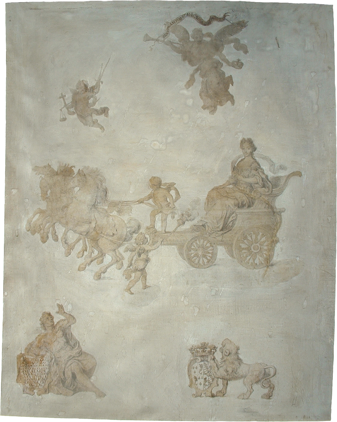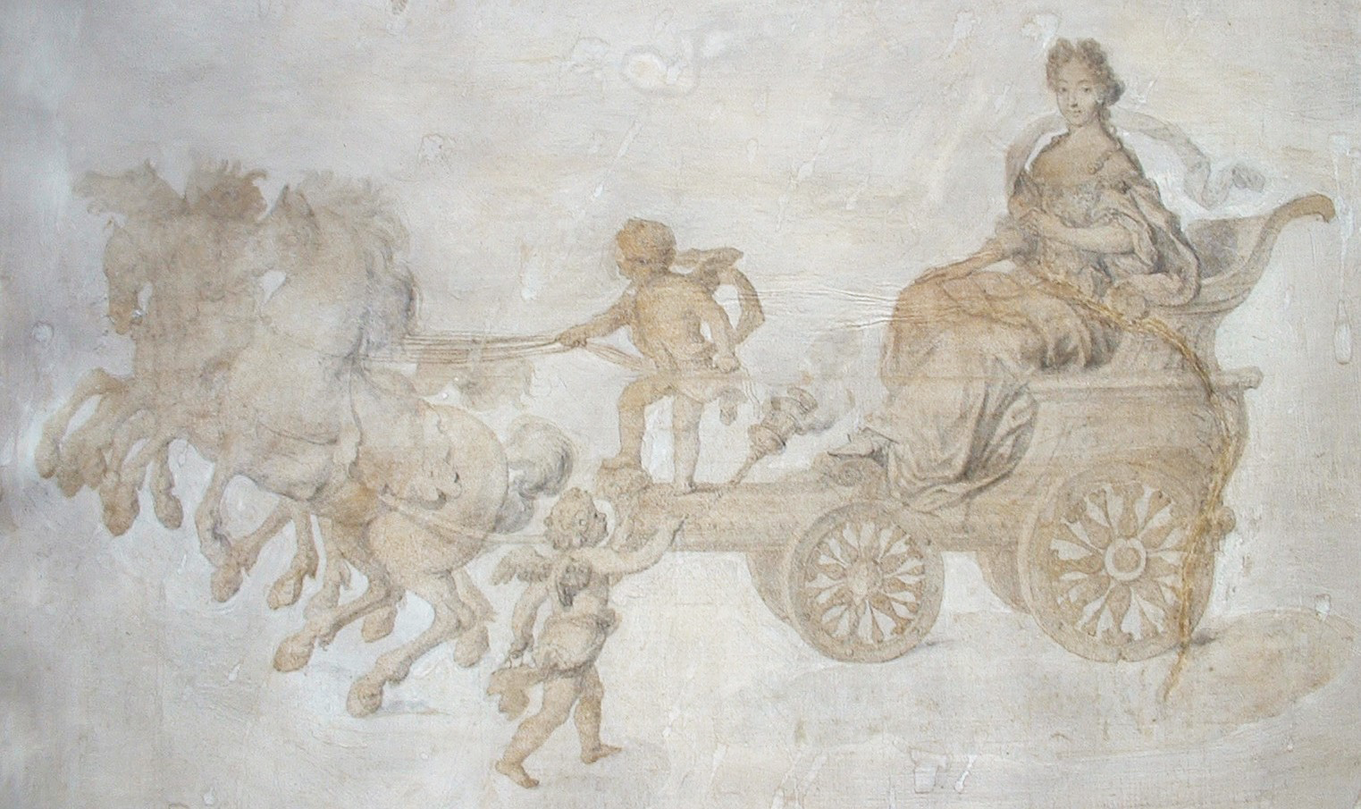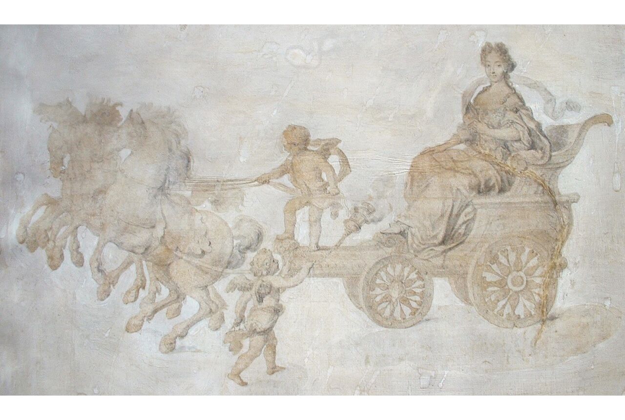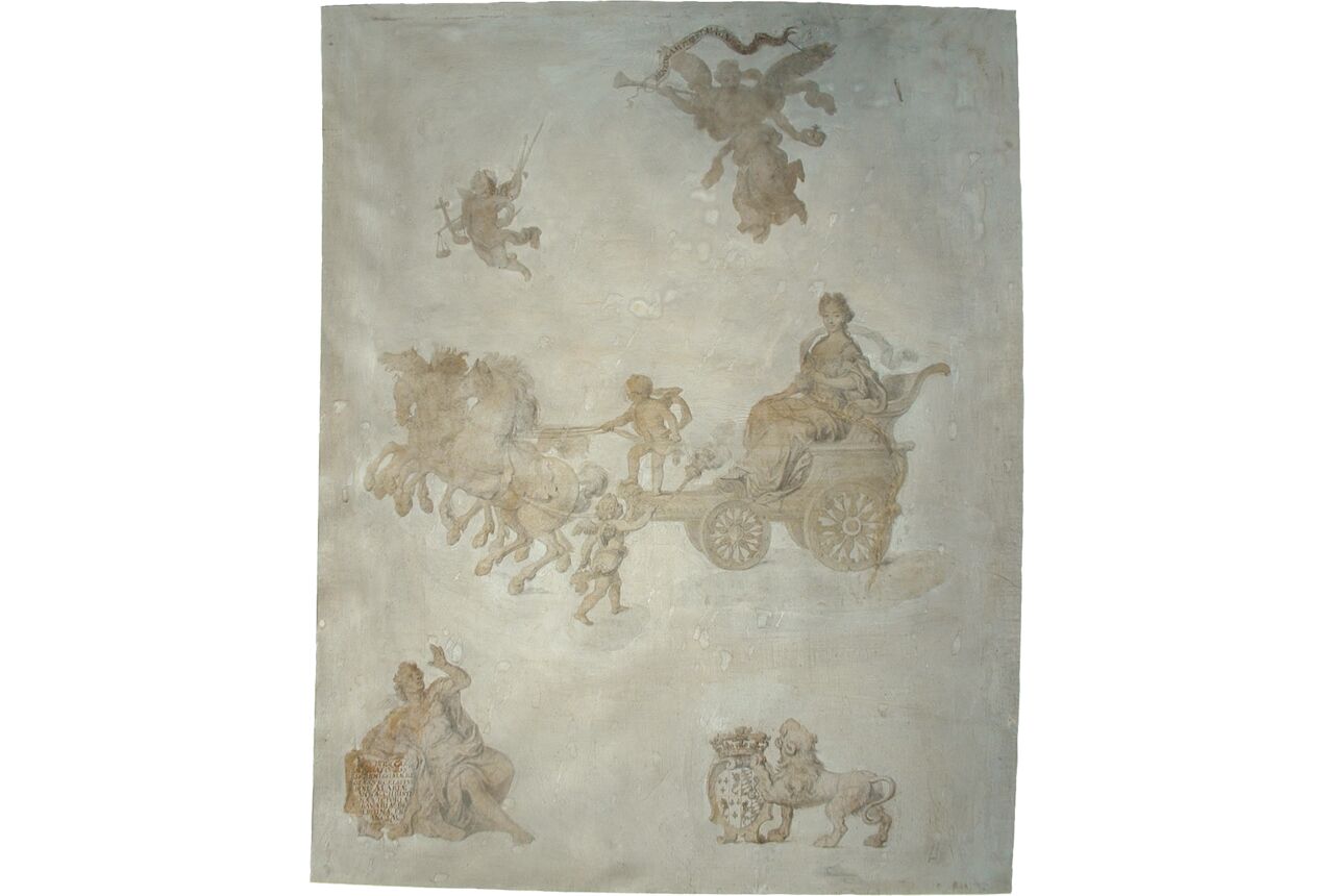 Whereas it is certain that Muligin wrote the poem, it is not likely that he designed the accompanying drawing; more likely, he collaborated with a draughtsman at court. The style and composition of the drawing recall work by Pierre Mignard (1610-1695). Official court painter, Mignard was shut out from the Academy and was quite active as a portrait painter. His specialization and his close ties with the court would have made him a likely collaborator with Muligin on the present project.