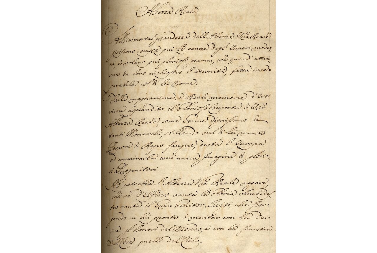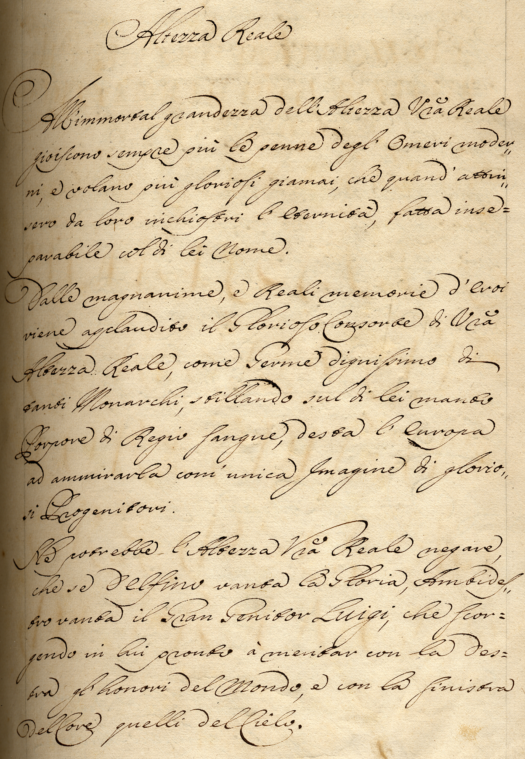 ff. 4rv, Dedicatory letter, incipit, “Altezza Reale. All’immortal grandezza dell’Altezza Vostra Reale gioiscono sempre piu le penne degl’Omeri…”;