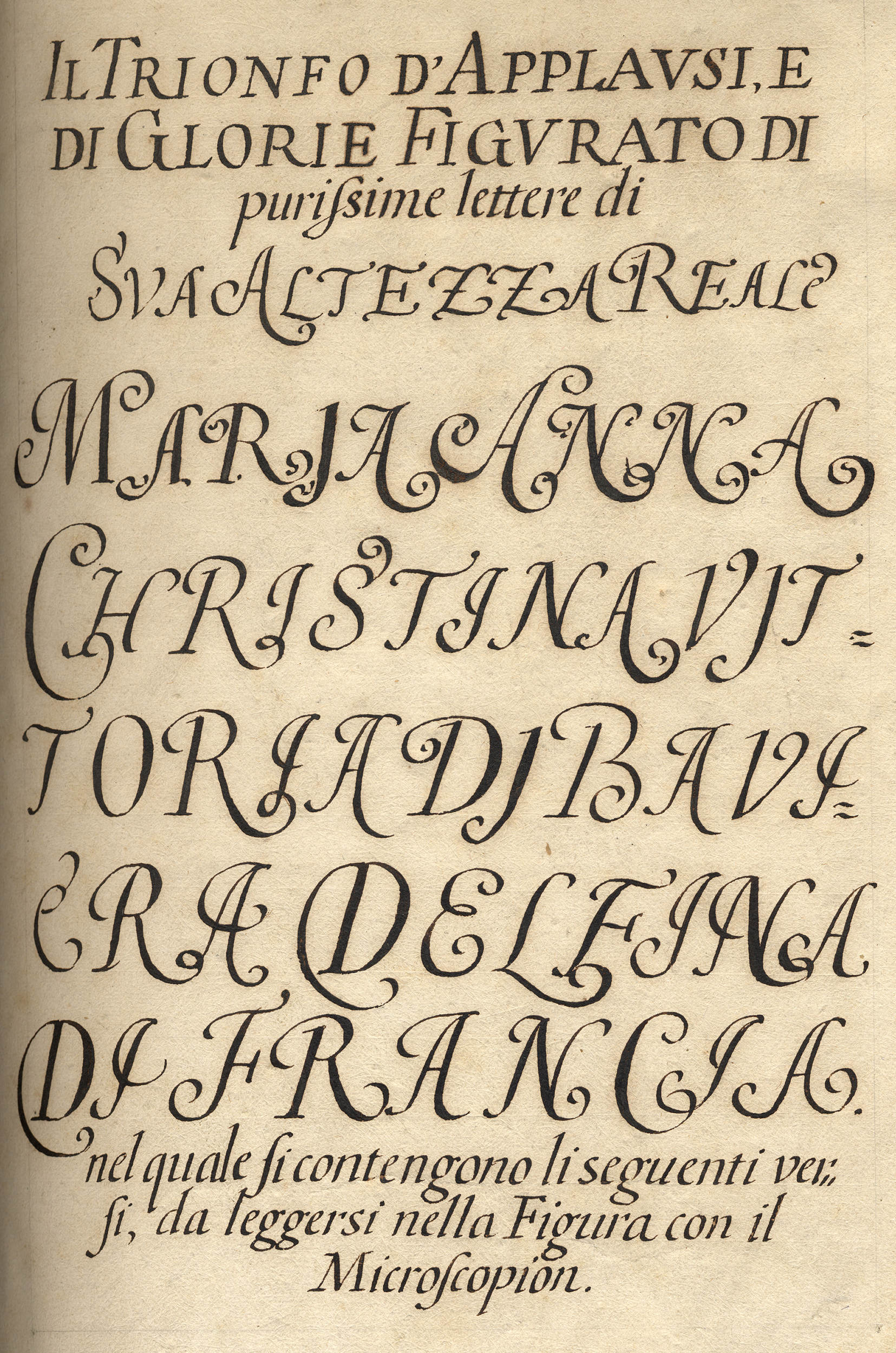 In a celebration of virtuosity, the artist used the entire text from the book to compose a drawing that illustrates the subject(s) of the manuscript, showing the Dauphine in a chariot drawn by horses with several figures: angels, a lion with the arms of the Dauphine, and Hercules. The figures of the drawing, which are very finely executed, are composed of the microscopic letters of the poem (also transcribed in normal scale in the manuscript that accompanies the drawing). The artist/calligrapher successfully created shaded and blank space by varying the placement of the letters. Although the letters are placed in diverse ways, they can only be read horizontally when observed with a magnifying glass.