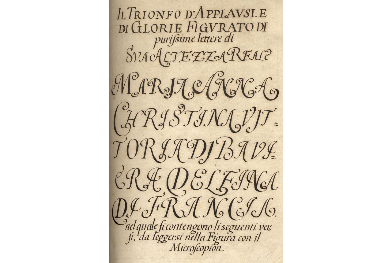 A second work by Muligin, a poem on the glory (la gloire) of the king with a translation of the life of Alexander the Great by Plutarch, confirms the diplomatic importance of our drawing. This second work, now Paris, Bibliothèque nationale de France, MS ital. 496 (published by Mazzatinti, vol. 1), was offered to the king in 1686 and kept in the royal library of Versailles, until it was transferred to the newly constructed royal library in Paris in 1738. Its binding is closely related to the binding of our manuscript (Mazzatinti, p. cxxxiii), and it was also an example of microscopic calligraphy, although it has never been identified as such because its drawing has become separated from the text and appears to be lost. The title, on f. 5, however, makes this quite clear: Real figura della Maestà del Gran Rè Ludovico XIIII di Francia & Navarra, delineata di purissime lettere, nella quale s’accompara, et distintamente descritta la Vita et Grandezze di Alessandro Magno fatta da Plutarco, con applausi festivi di sonetti fatti alle glorie della Maestà Sua, finita con gran fattiche l’anno 1686 la sopradetta real figura da me sottoscritto. Ignatio Francesco Muligin Inventore.