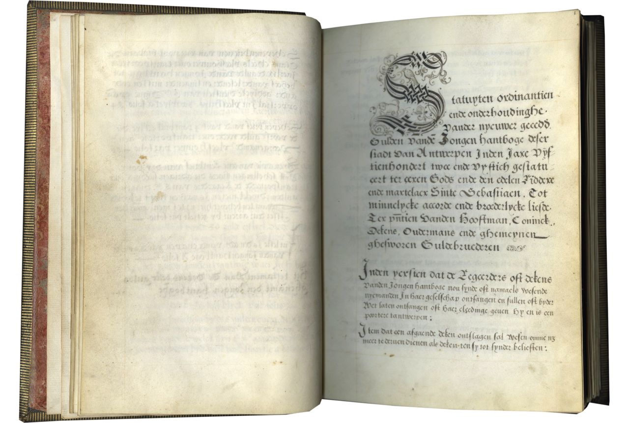 The manuscript is the first, and likely only, privilege-book of the Jongen Handboge (“Young Handbow”), one of four archery guilds in premodern Antwerp (the others being Oude Handboge (Old Handbow), and Oude and Jonge Voetboge (Old and Young Footbow). These civic societies overlapped, with members of the “Young” guilds – which, contrary to their names, were not youth groups, but “new guilds of lesser status” (Crombie, 2016, pp. 57-59 at 57) – elected to the “Old” as spaces opened up (Prims, 1929, pp. 38-39, 42). In 1552, Emperor Charles reformed Antwerp’s six armed guilds, augmenting their size, handing greater control to municipal authorities, and moving towards compulsory imperial service (Prims, 1929, pp. 42-43). Compiled in 1575, close on the heels of these changes and during a period of escalating political tensions, this book may betray guild concerns to secure existing privileges. Covering documents for 1478-1571 – many known only through this manuscript (Prims, 1929, p. 38) – with later additions, the whole is the work of three scribes, two working c. 1575; the third, in the mid-seventeenth century.