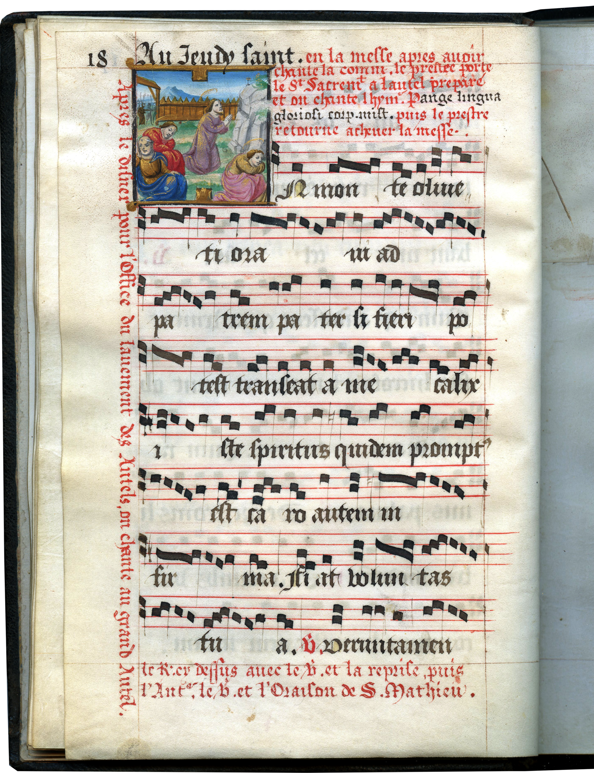 pp. 18-21, Au Jeudy saint en la messe apres auoir chante … puis le preste retourne acheuer la messe, incipit, “In monte oliueti …; [p. 19, rubric an early addition], Pendant quon chante ce Respons … apres la reprise du Respons on chante lantiene de S. Mathieu patron de cette eglise, incipit, O beate Mathee … ; [p. 20, original scribe], A l’Autel de S. Marcoul. Respons, incipit, Circum dederunt me … ;
