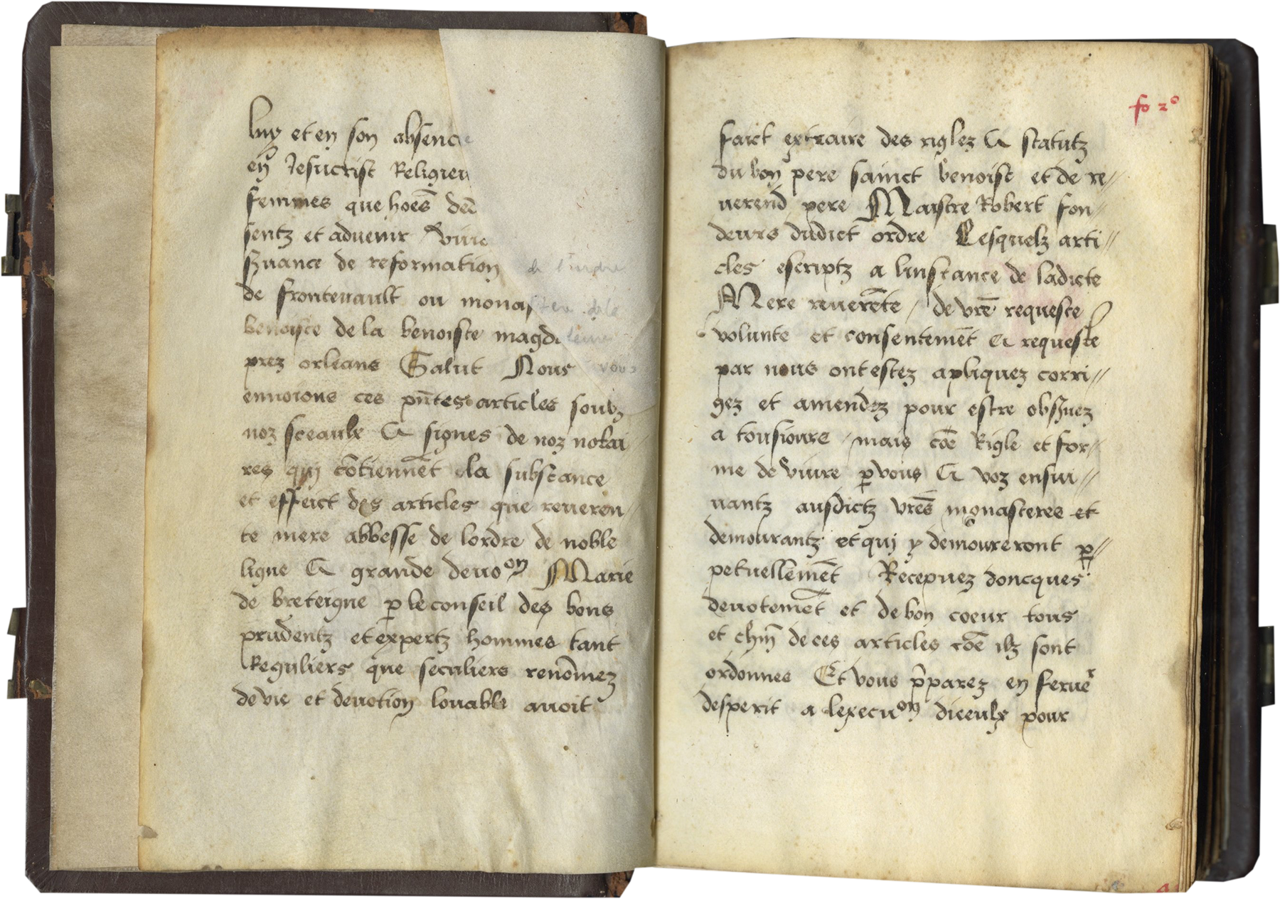 ff. 1-149v, [Part one], incipit, “[Au] non de nostre seigneur [Jesu C]hriste. Nous Jehan par la misericorde de Dieu, archevesque de Bourges, primat d’Aquitainie, et Louis Pot, abbe du monastere sainct Laumer de Blois du diocese de Chartres, par le subscripsit siege apostolique especiallement deputez Juges et executeurs du contenir en ce present escript avecques aultres nom condelequem en ceste partie avecques la clarise, qua tenus duo et cetera vobis et cetera, Et Jehan Berthelot chanoisne en l’esglise de Tours lequel nous archevesque et abbe avons accepte comme subdeleques tres reverend pere l’archevesque de Lion, primat de France por lui et en son absence en Jesuchrist Religieuse femmes que hommes ... sentz et advenir ... (ob)servance de reformation de l’ordre de fontevrault ou monastere ... Benoiste de la benoiste madgalene pres orleans. Salut Nous vous envoions ces presentes articles soubz noz sceaulx et signes de noz notaires qui contiennent la substance et effeict des articles que reverente mere abbesse de l’ordre de noble ligne et devotion Marie de Breteigne par le conseil des bons prudentz et expertz hommes tant Reguliers que seculiers renommez de vie et devotion lovable avoit faict extraire des riglez et statutz du bon pere sainct benoist et de reverend pere Maistre Robert fondeurs dudict ordre. Lesquels articles escriptz a l’instance de ladicte Mere reverente, de vostre requeste, volunte et consentement et requeste par nous ont estez apliquez, corrigez et amendez pour estre observez a tousjoure, mais comme Regle et forme de vivre pour vous et voz ensuivantz ausdictz vostres monasteres et demourantz et qui y demoureront perpetuellement. Recepvez doncques devotement et de bon coeur tous et chacun de ces articles comme ilz sont ordonnee. Et vous preparez en servir desperit a l’execution diceulx pour le salut de voz amis. La grace et benediction de Jesuchrist vous voeulle conforter a ceste oeuvre devotement commencer. (the end of the introduction) Asleves doncques devotement vostre pensee a entendre l’admonition du bon pere sainct benoist ... [f. 117v] quand el Jour de salut adviendra ou//” [the first part ends imperfectly, lacking one leaf, followed by a table of contents on ff. 118-121, and three blank pages ff. 121v-122v];