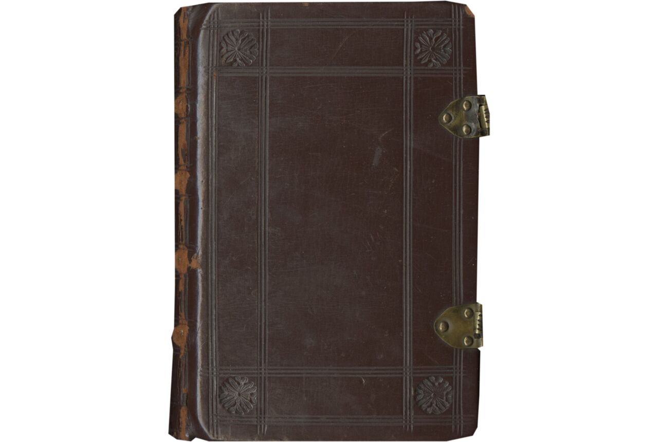 i + 149 + i folios on parchment, original foliation in red ink and Roman numerals, “fo pa, fo zo, fo 3o, fo qro, fo vo, fo viio ... cxixo”, (followed by 5 unnumbered leaves), “fo iio, iiio ... xxiii”, (followed by 5 unnumbered leaves), modern foliation in pencil, 1-149, lacking five leaves (collation i8 [-8, lacking one leaf after f. 7, with loss of text] ii6 iii-xi8 xii8 [-1, lacking one leaf after f. 85, with loss of text] xiii-xv8 xvi8 [-2, -8, lacking one leaf after f. 117, with loss of text, and one blank leaf after f. 122] xvii6 [-1, lacking one leaf after f. 122, with loss of text] xviii8 xix10 xx4), vertical catchwords, alphanumerical signatures in red ink (mostly cropped), ruled in gray ink (justification c. 110 x 70 mm.), written in brown ink in gothic cursive bookhand on 17-18 long lines, several letters on the last lines have elaborate descenders (e.g. on ff. 5, 57, 62v the descenders develop into large leaves in the lower margins), capitals touched in yellow, important passages underlined in yellow, rubrics in red, line-fillers are foliage, flowers, cartouches drawn in ink and yellow wash (e.g. ff. 108, 113), 2- to 4-line initials in brown and red inks often decorated with human profiles, interlacing ornamentation (cadels), flowers, or foliage, line-fillers with similar flower or foliage in red and brown inks, lacking a part of the first leaf including the first words of text, the lacune (c. 60 x 40 mm.) has been repaired with modern parchment and some of the lacking words have been inserted in pencil, a tear in the lower margin of f. 59, stains and signs of use, in overall very good condition. Bound in the nineteenth century in brown calf over wooden boards, covers blind-tooled with a frame design with triple fillets and fleurons in the corners, spine with four raised bands blind-tooled with fleurons, two pairs of brass clasps and catches, leather worn along the hinges of the spine and corners, in overall very good condition. Dimensions 149 x 98 mm.