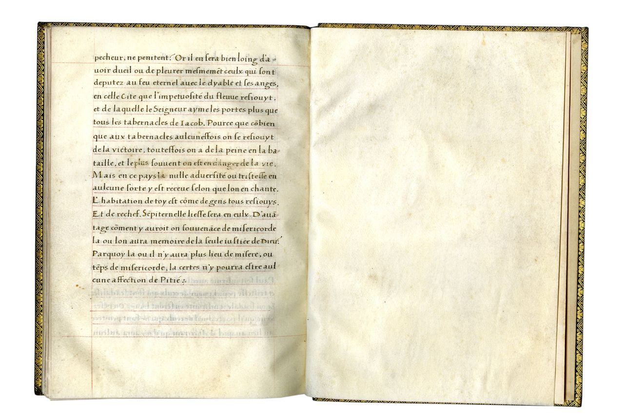 This particular French vernacular translation has never been edited and published. Linguistically it constitutes a most interesting link or middle-ground version between the late twelfth-century version (published by S. Gregory, 1994) and the later seventeenth-century translations such as the one by the Feuillant monk Antoine de Saint-Gabriel (published Paris, 1664). It is a testimony to the endurance of Bernardine spirituality in the sixteenth century, as well as a fine example of humanistic calligraphy. Last but not least, one can only underscore the beauty of the French language in this first half of the sixteenth century. Further research on the study of Bernard of Clairvaux in the sixteenth century might yield clues as to who might have commissioned this translation, but above all it merits to be published for its own merit.