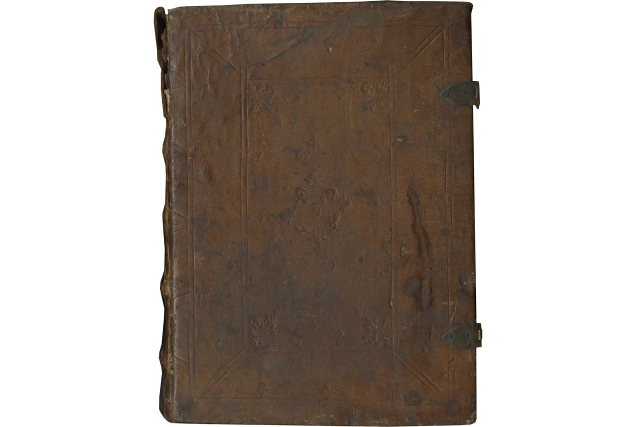 i (paper) + 170 folios on parchment, original foliation in red roman numerals top outer corner recto, i-clxvii beginning on f. 4, with f. 136bis, first three leaves, originally unnumbered, with modern foliation i-iii, missing one leaf (collation i3 ii-xviii8 xix8 [-3, one leaf, f. 138, with loss of text] xx-xxi8 xxii8 [structure uncertain]), flourished horizontal and vertical catchwords, imperfectly alternating, no leaf or quire signatures, ruled in purple ink with full-length vertical bounding lines, (158 x 113-112 mm.), written in a formal gothic bookhand in two columns of 22 lines, guide notes for the rubricator occasionally visible, majuscules within the text highlighted in pale yellow, red rubrics, one-line polished gold initials with black penwork, countless two-line polished gold initials infilled and on notched grounds of blue and pink with white highlights, three 3- to 2-line pink or blue initials with white highlights on gold grounds with flowers, and THREE ILLUMINATED BORDERS, C-shaped, ff. 1, 45v (Easter), 86 (Canon), green, pink, red, and blue acanthus, some with white small dots used as highlights, with colored flowers and leaves on black hairline stems, infilled with black-rayed gold besants, with vivid birds, and on f. 86, a small naked child covered in hair in the upper margin, ONE RECTANGULAR MINIATURE on f. 86 in a narrow gold frame, equivalent to 8-lines of text, of the Crucifixion, set in a green landscape with a road visible, excellent condition apart from cockling and occasional dirt, especially in the gutter, lower border f. 86, slightly rubbed, initial f. 102v, smudged. BOUND IN 16TH-CENTURY brown leather over wooden boards, tooled in blind with two sets of fillets, forming an outer frame around a rectangular center panel with three fleurons down the center and a fleuron in each corner, spine with five raised bands, with a small fleuron stamped between each pair of bands, speckled edges, two clasps with brass fasteners, fastening front to back, covers worn, spine covering worn and fragile, split at the top along the joint, boards slightly bowed. Dimensions 225 x 164 mm.